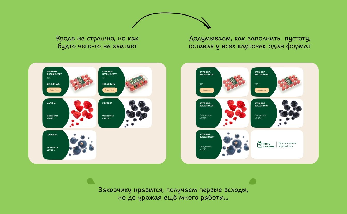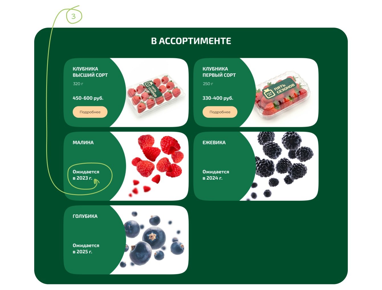 В каталог заложили идею разных фонов, цвет которых у каждой ягоды был бы свой. Но, чтобы избежать пестроты, каталог свернули в слайдер.