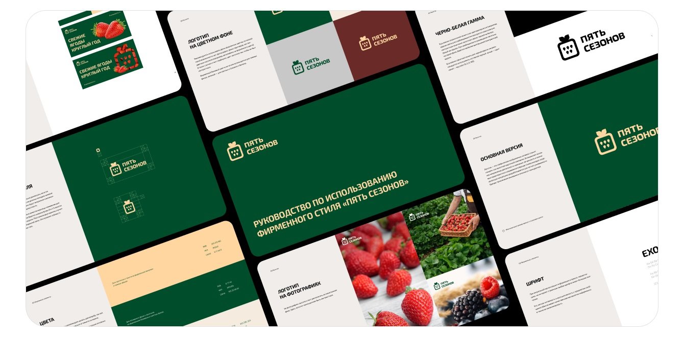 Тут образ был построен на основе логотипа «Пять сезонов» — прямоугольные, закруглённые формы, напоминающие геометрию силуэта упаковки.