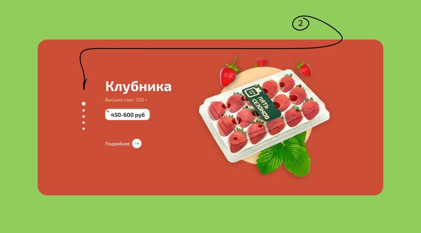 Чтобы учесть наш нюанс - не делать акцент на будущих продуктах, но дать понять, что производят не только клубнику, решили убрать другие ягоды в слайдер на главном экране. При этом показать наличие других ягод сразу через пагинаторы в виде миниатюр.