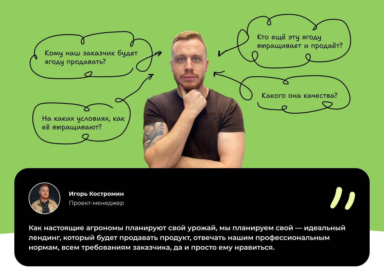 Теперь расскажем подробнее об этапах разработки лендинга от посева и аналитики до отгрузки заказчику или историю о том, как мы чуть не открыли агрохолдинг ONE PAGE...