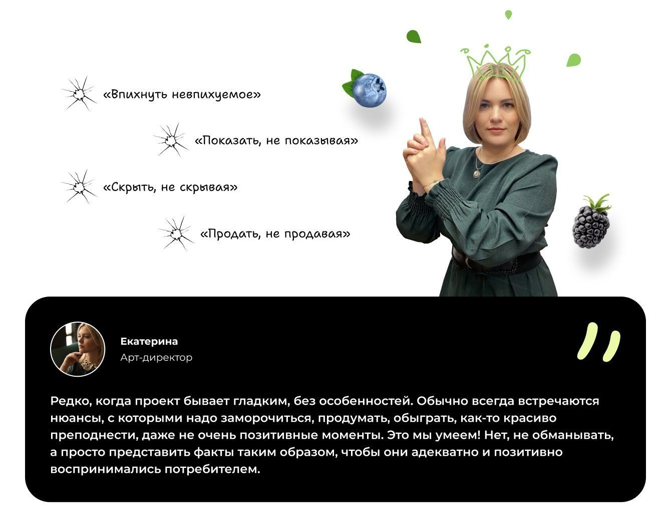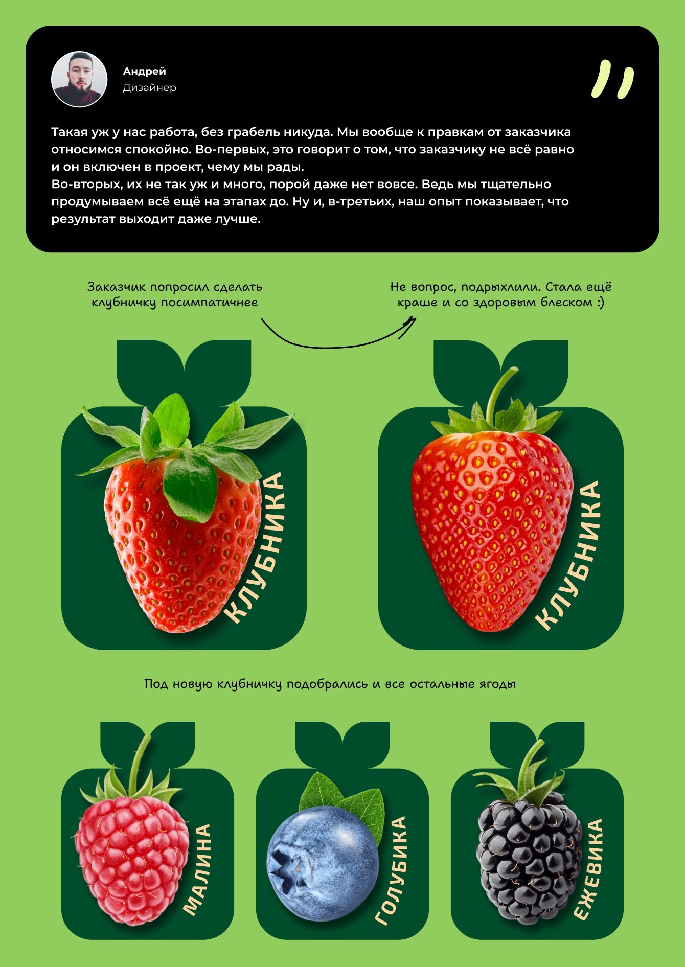 В данном проекте к серии «Показать не показывая и скрыть, не скрывая» относился пока ещё не существующий ассортимент, который нужно было показать, но не сильно. При этом сделать акцент на клубнику, но не только.