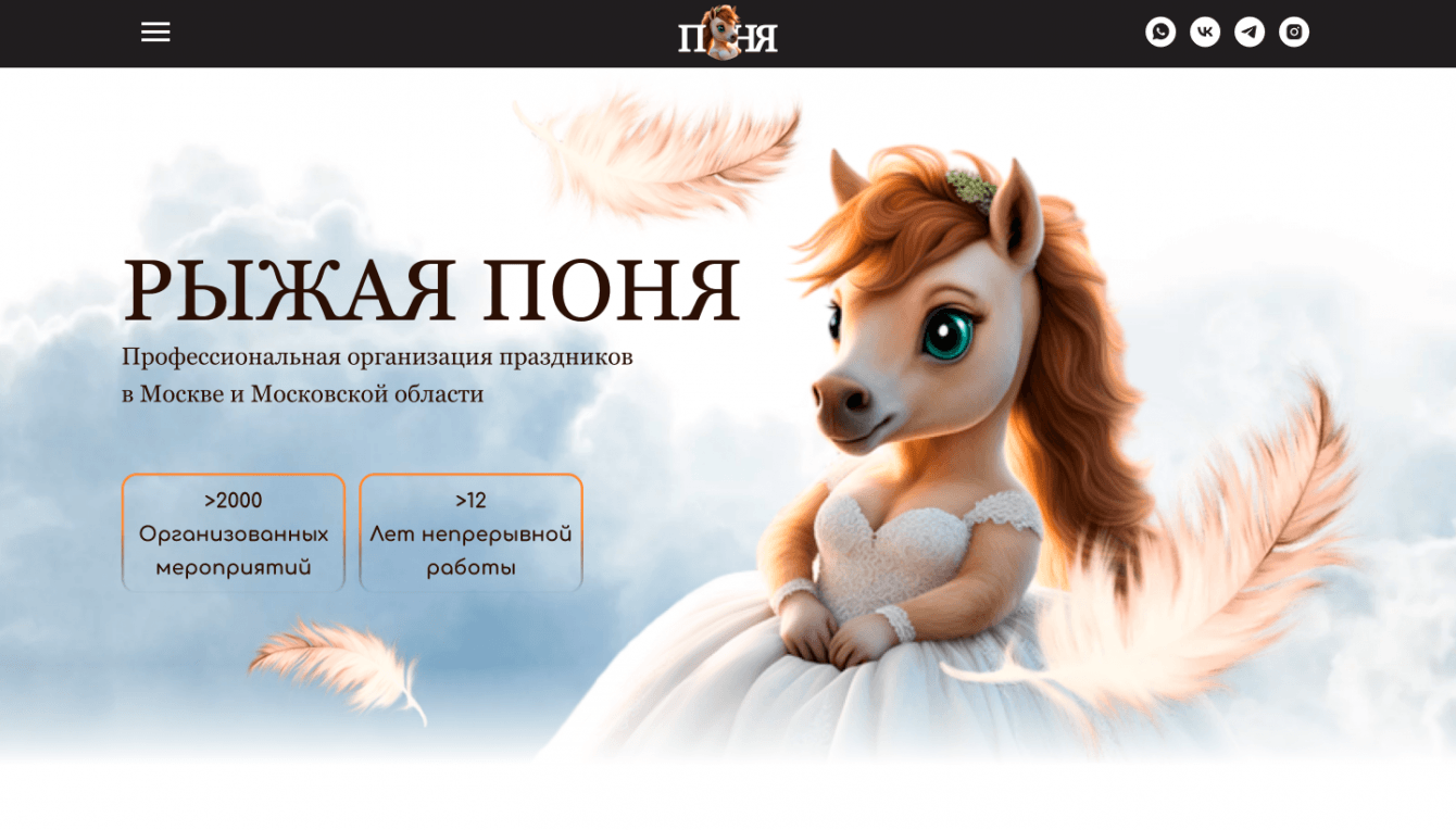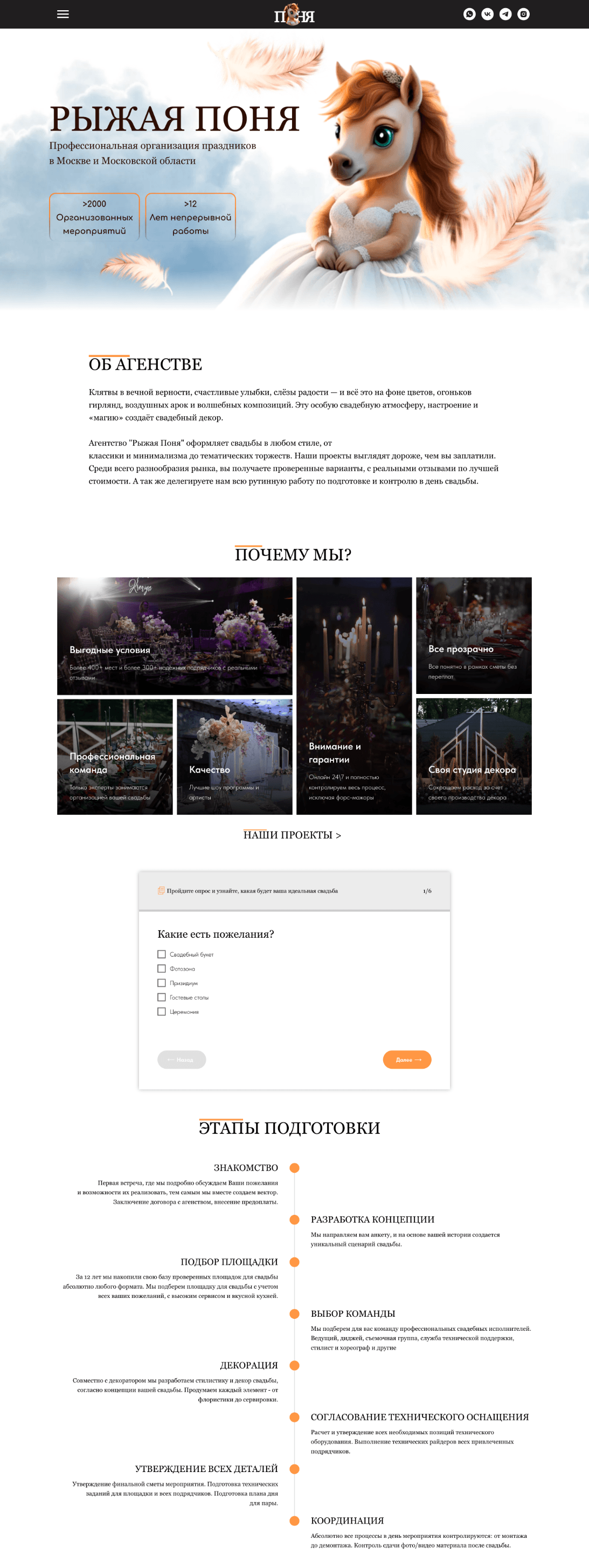 Клиенту в дополнение к активным социальным сетям был необходим экспресс сайт, который бы отображал суть свадебного настроения и милой пони. Так же с добавление опросника невесты, ибо как показал анализ такие опросы значительно привлекают внимание. Обязательно было необходимо наличие портфолио клиента для детального отображения настроения и качества его услуг.