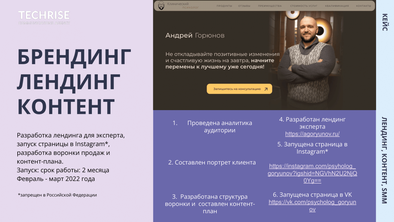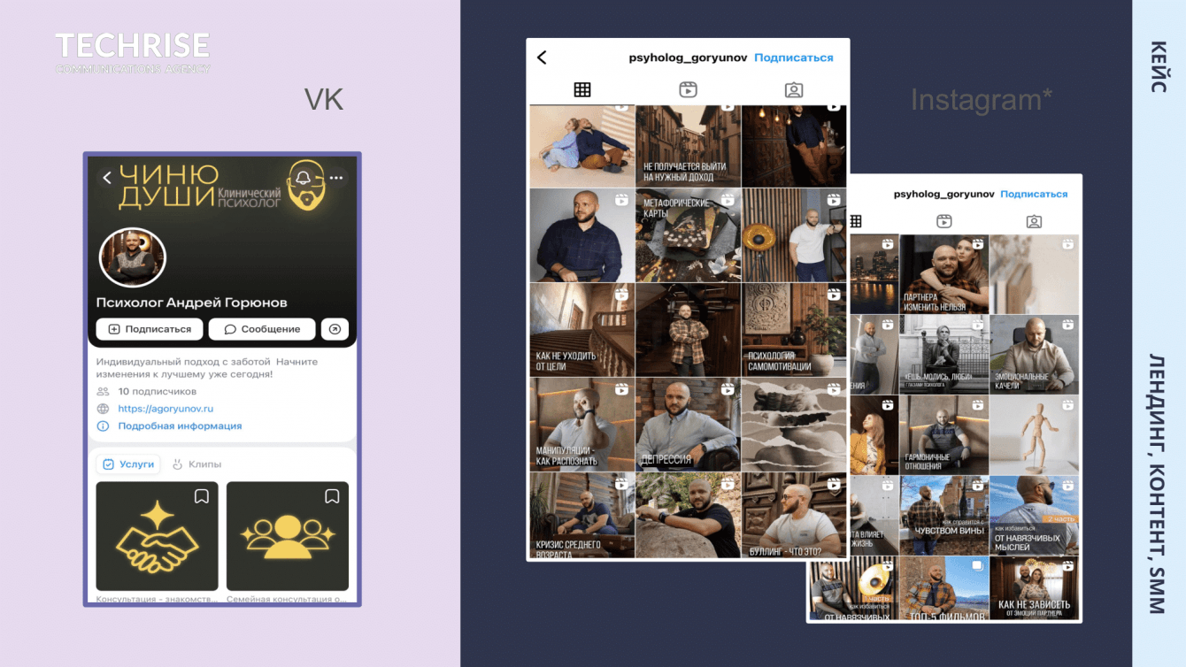 Мы разработали лендинг, включили в него лидмагниты и настроили воронку в социальных сетях. Размещая контент согласно контент-плану, клиент получил приток новых потенциальных клиентов и запросов на оказание услуг.