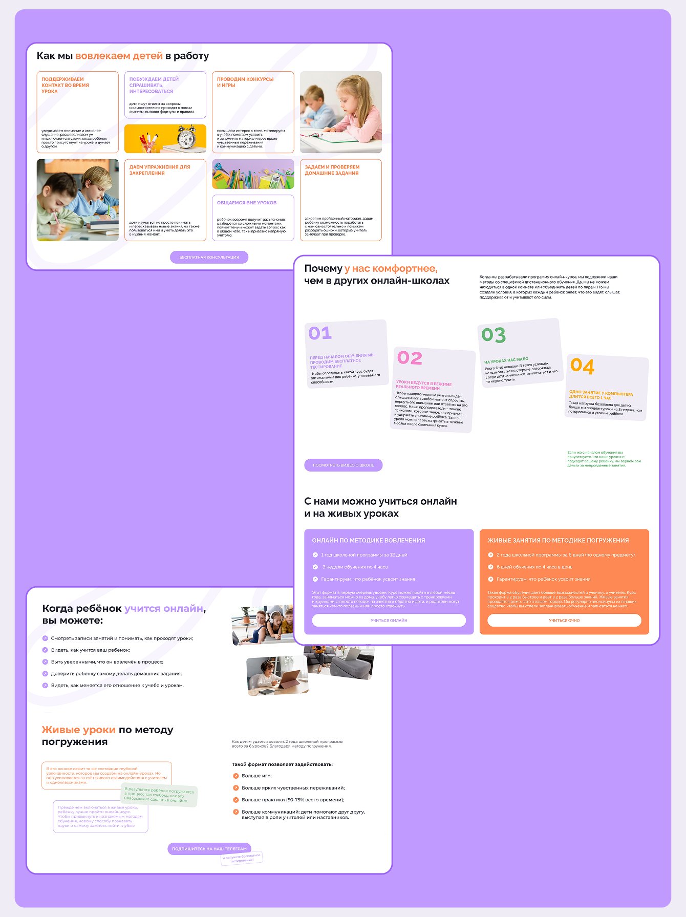 - Разработали дружелюбный и яркий дизайн, использовав закругленные формы, сочные цвета, фотографии детей. Сделали фокус на эмоциональную составляющую обучения;