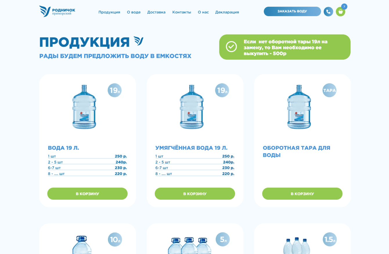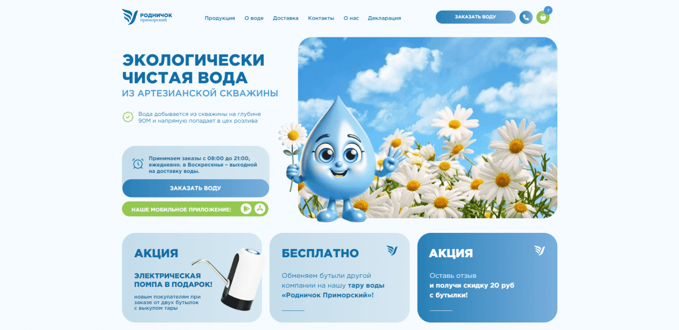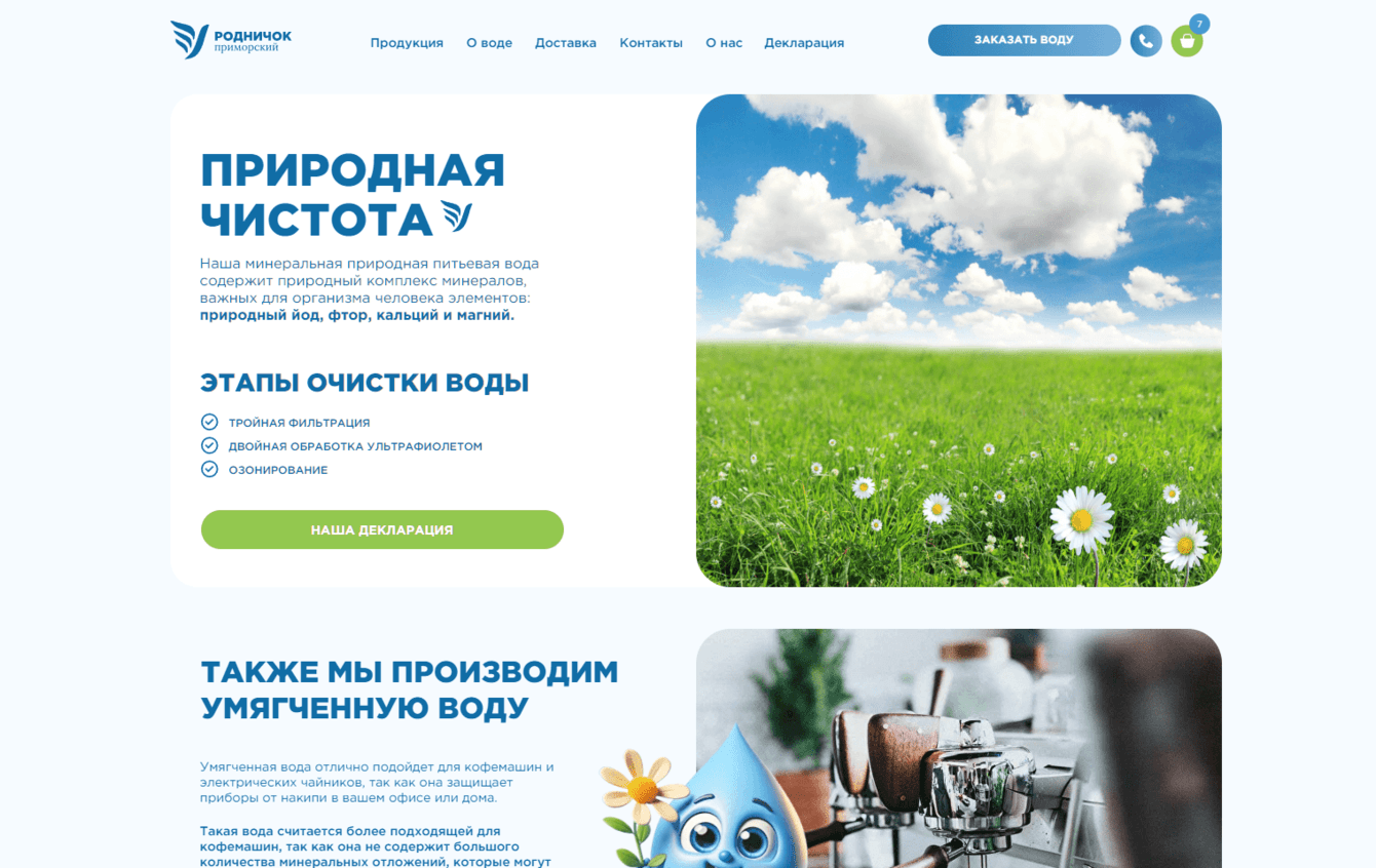 Интересным проектом для нас стала разработка лендинга для сервиса доставки воды "Родничок Приморский". Основная задача заключалась в создании простого лендинга, на котором был бы представлен ассортимент продукции, условия доставки, а также возможность заказа определённого объёма продукции.
