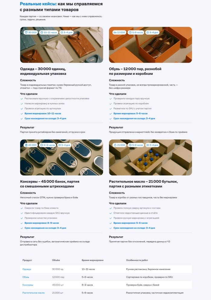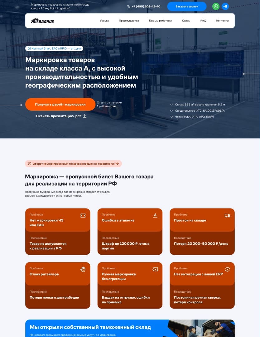 Посадочная страница помогла запустить новое направление без лишних тестов и доработок после старта. Лендинг сразу закрывал ключевые вопросы клиентов: как проходит маркировка, какие требования нужно соблюсти и почему услугу удобно делать на таможенном складе. Если вам нужно запустить новую услугу или упаковать сложный B2B-продукт в понятный лендинг — можно сделать страницу, которая сразу готова к рекламе и нормальной конверсии.
