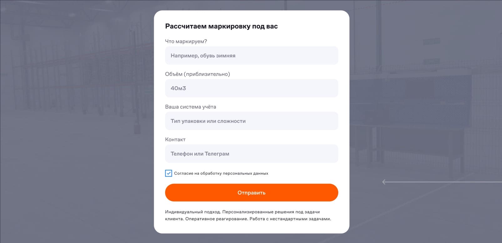 Дополнительно важно было избежать размытия трафика: ниша маркировки слишком широкая, а услуга клиента — узкая и специализированная. Поэтому посадочная страница должна была сразу отсеивать нецелевые запросы и привлекать компании, которым нужна маркировка в рамках таможенного оформления и складской логистики.