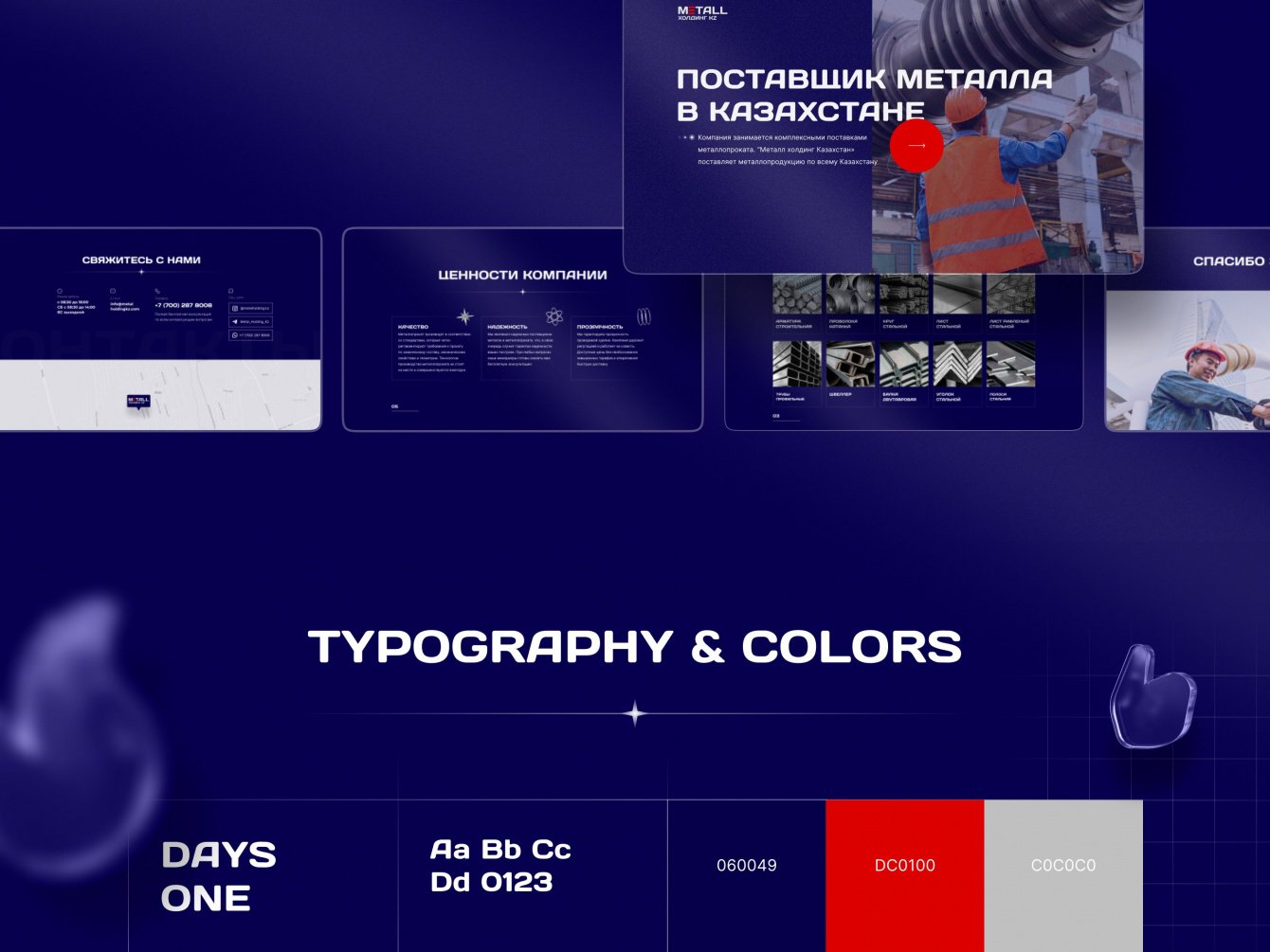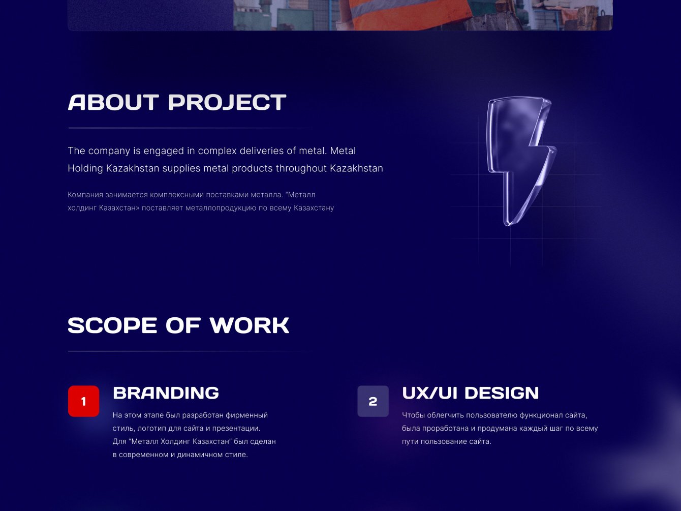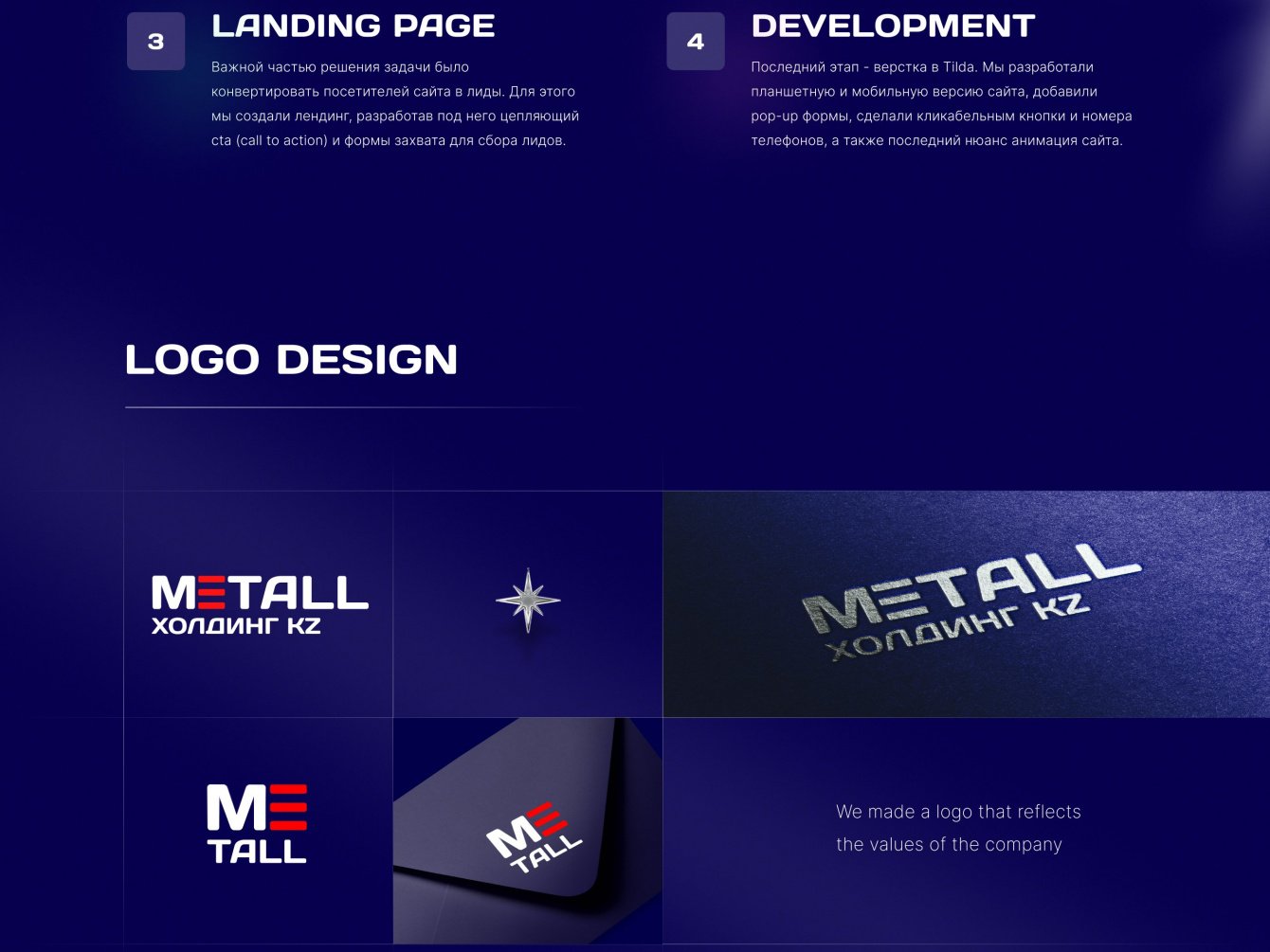 На этом этапе был разработан фирменный стиль, логотип для сайта и презентации. Для “Металл Холдинг Казахстан” был сделан в современном и динамичном стиле.