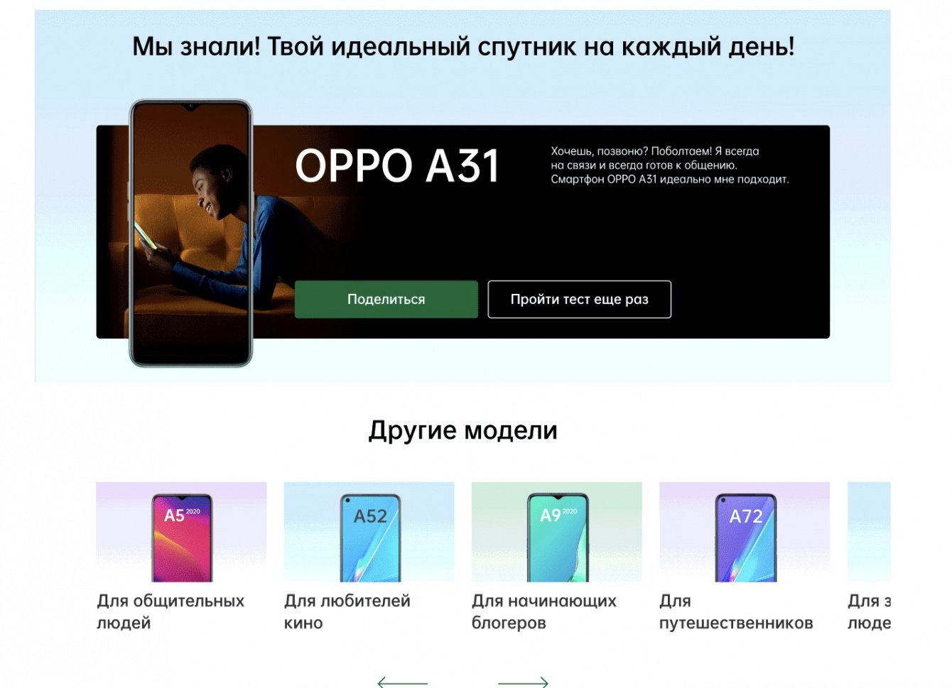 Для реализации задачи требовалось создать дизайн-концепцию лендинга. Разработать и реализовать механику тестирования, в результате которой пользователям, на основе их предпочтений, будет рекомендована определенная модель смартфона.