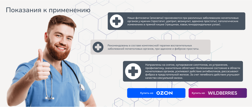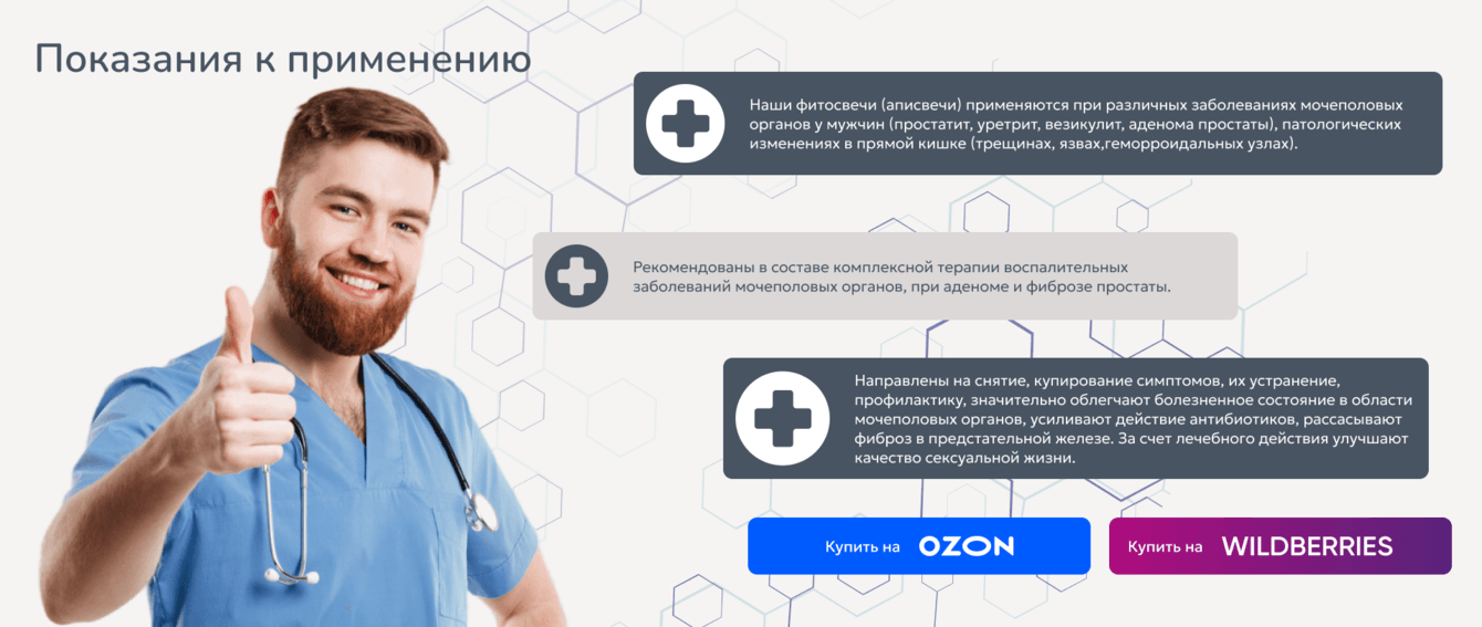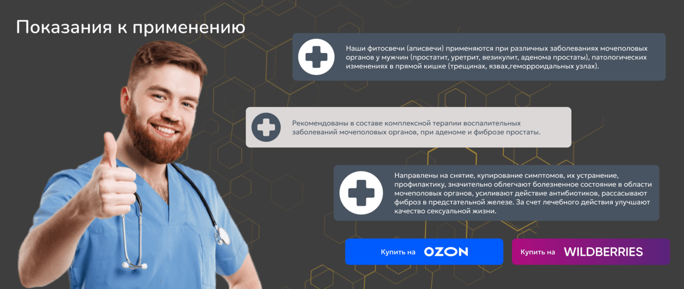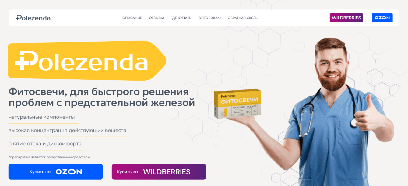 - позиционируем и рассказываем об основных преимуществах препарата в верхнем баннере. Для самых нетерпеливых в этом же блоке приводим кнопки призыва к покупке товара на маркетплейсах WB и Ozon: