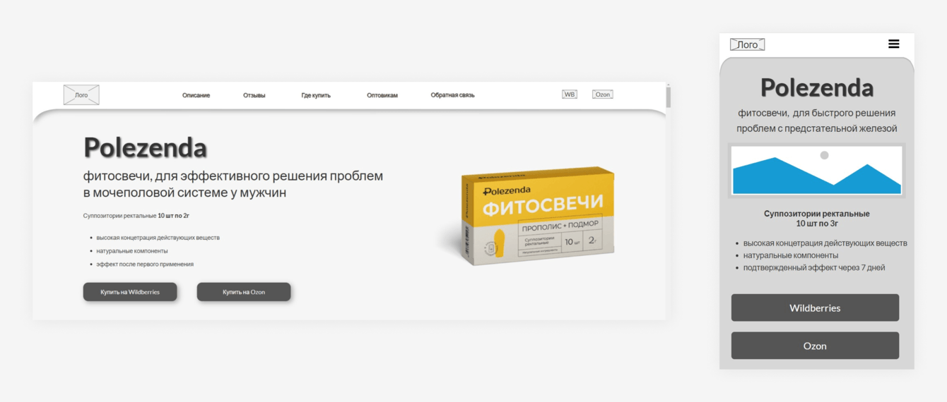 В результате получили лендинг, который предоставляет полную информацию о препарате. В дизайне использовали элементы, которые создают ассоциацию с натуральностью компонентов, с основным действующим веществом – прополисом. Рассказали о способах приобретение препарата – для оптовиков, через заявку на лендинге, для розничных покупателей в магазине на маркетплейсах WB и Ozon.