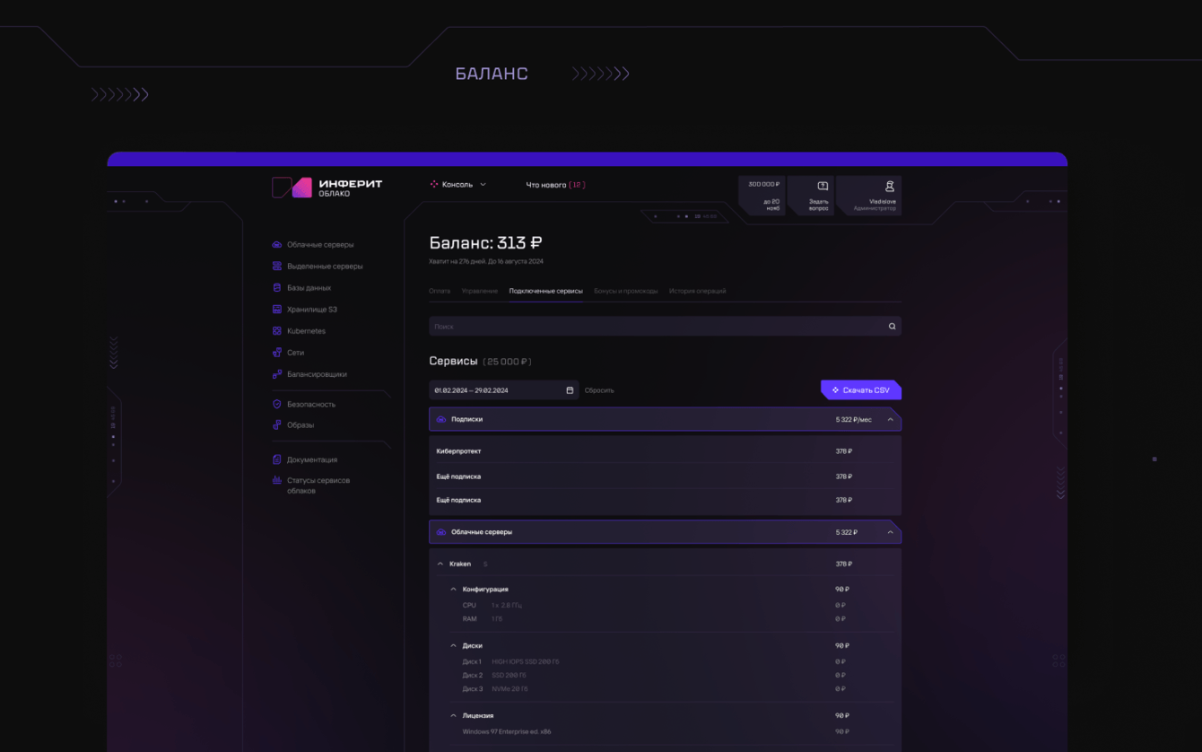 Вместе с командой «Инферит Облака» мы разработали фичи для тарификации и расчета стоимости продуктов. Расчет происходит автоматически при добавлении ресурсов. В личном кабинете доступна детализация расходов.