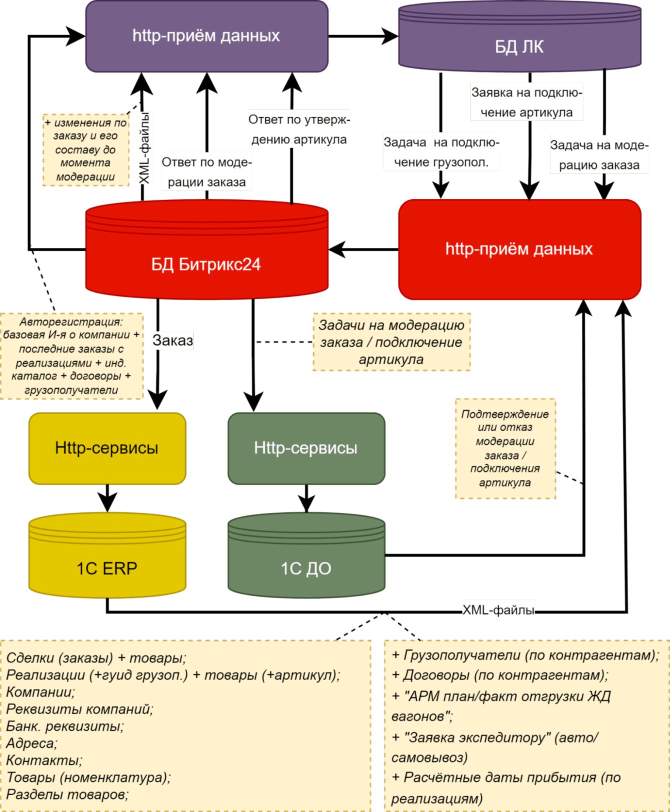 Например, вот так выглядела диаграмма, проясняющая предстоящее взаимодействие четырёх систем (сайт личного кабинета, Битрикс24 и две 1С-ки):