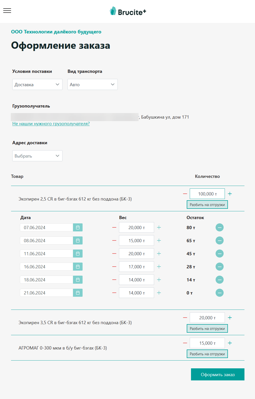 Страница оформления заказа с разбиением на желаемые отгрузки: