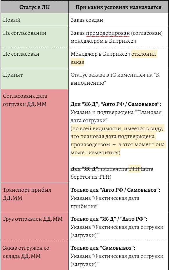 А рабочая таблица по назначению статусов отгрузкам в личном кабинете была составлена примерно следующим образом: