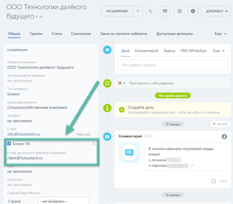 Менеджеру достаточно в карточке компании Битрикс24 отметить её соответствующим "флажком" – личный кабинет для этой компании будет создан в полностью автоматическом режиме: из 1С "затянется" вся история заказов этой компании, все данные для оформления новых заказов (доступные к заказу товары, адреса прошлых доставок и ж/д-станций, грузополучатели и пр.), а логин и пароль от созданного кабинета будут высланы клиенту прямо на электронную почту: