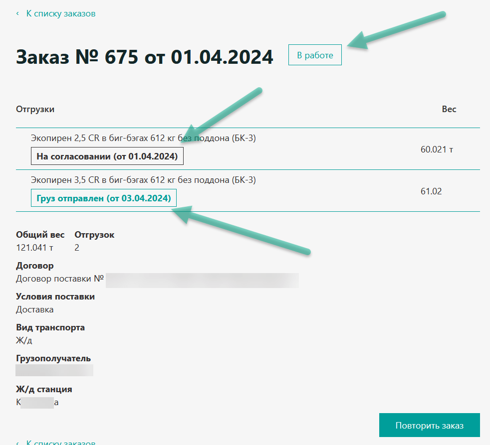 Так как покупатели часто заказывают однотипную продукцию, то для их удобства был реализован функционал повторения (копирования) заказов – включая уже произведённое ранее разбиение на отгрузки. Это экономит их время и снижает вероятность ошибок.