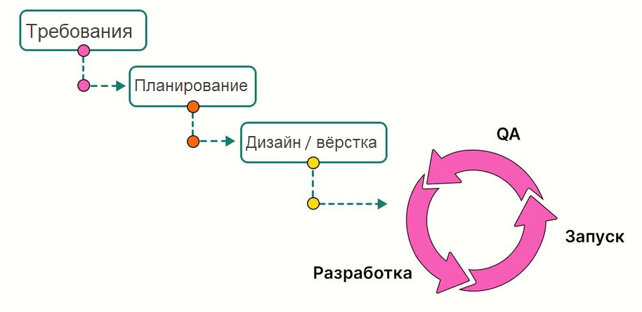 Также по итогу обсуждения с клиентом было принято решение двигаться по проекту по гибридной модели разработки: вся предварительная работа по проекту (сбор требований, обсуждения, аналитика, базовое проектирование, написание ТЗ и пр.) делается по поступательно каскадной модели ("водопад"), а собственно реализация – относительно небольшими agile-циклами: