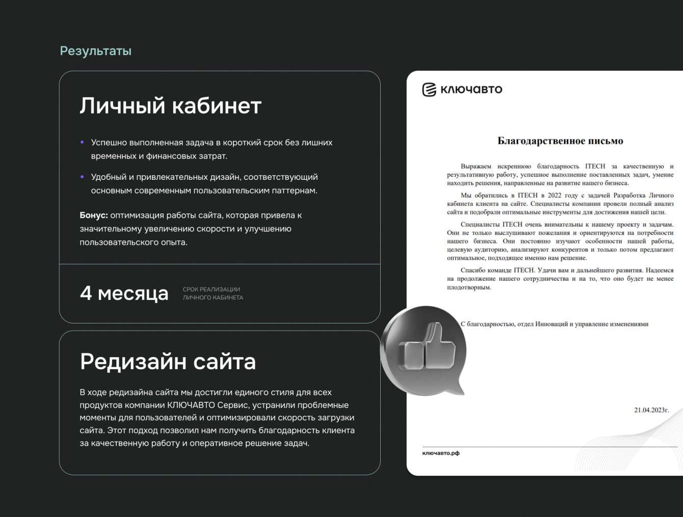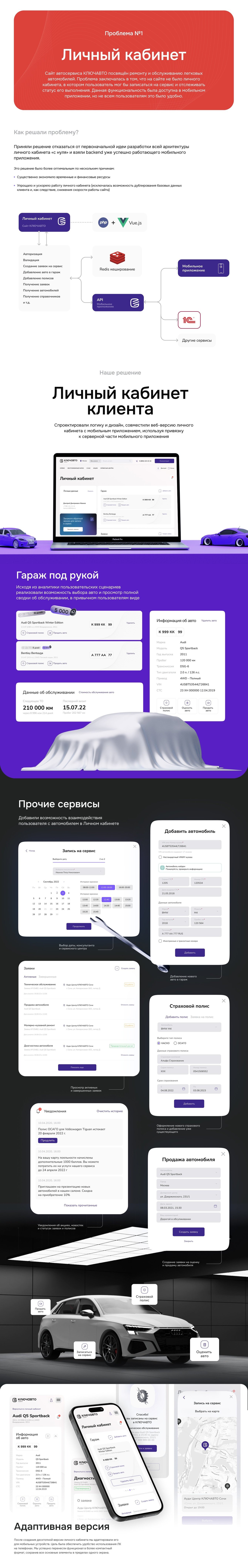 Сайт автосервиса КЛЮЧАВТО посвящён ремонту и обслуживанию легковых автомобилей. Проблема заключалась в том, что на сайте не было личного кабинета, в котором пользователь мог бы записаться на сервис, а после отслеживать статус его реализации. Данная функциональность была доступна в мобильном приложении, но не всем пользователям это было удобно. Также общий облик сайта устарел и не соответствовал обновлённому фирменному стилю.