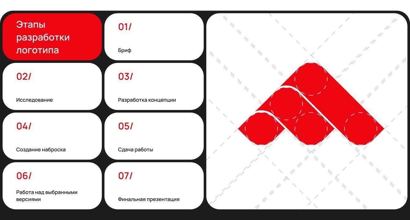 Провели совместный сбор понравившихся ему референтных работ, которые подходят по смысловому сообщению, заложенному в них, а также и те, что не вдохновляли заказчика. Помимо аналитики предоставленного материала и конкурентов, был проведен небольшой анализ целевой аудитории, который впоследствии дал нам конкретное направление работы. Этот подход позволил учесть предпочтения клиента и особенности его бизнеса, что способствовало созданию логотипа, соответствующего потребностям целевой аудитории.