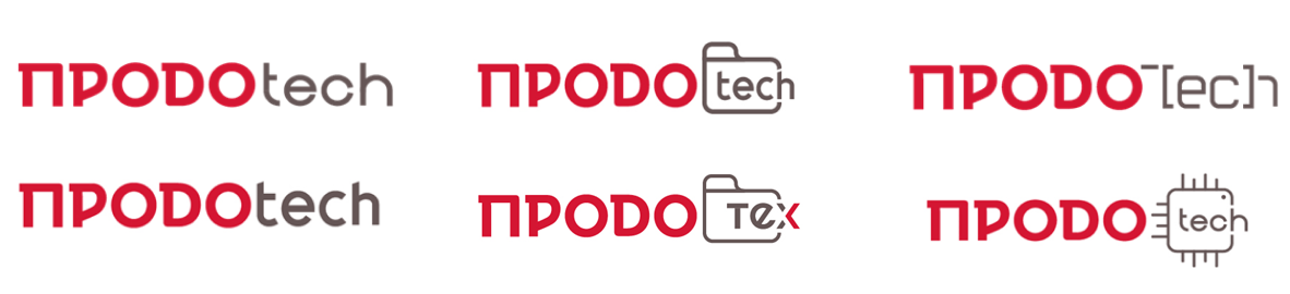 Изначально предполагалось использовать только символы кириллицы верхнего и нижнего регистра. Дизайнер разработала несколько логотипов в фирменном красном и двух основных оттенках, взяв за основу логотип «ПРОДО». Это позволяло поддержать единство стиля и сделать акцент на IT-направлении «ПРОДОТЕХ». Проведя внутреннюю оценку, представили пять лучших логотипов клиенту.