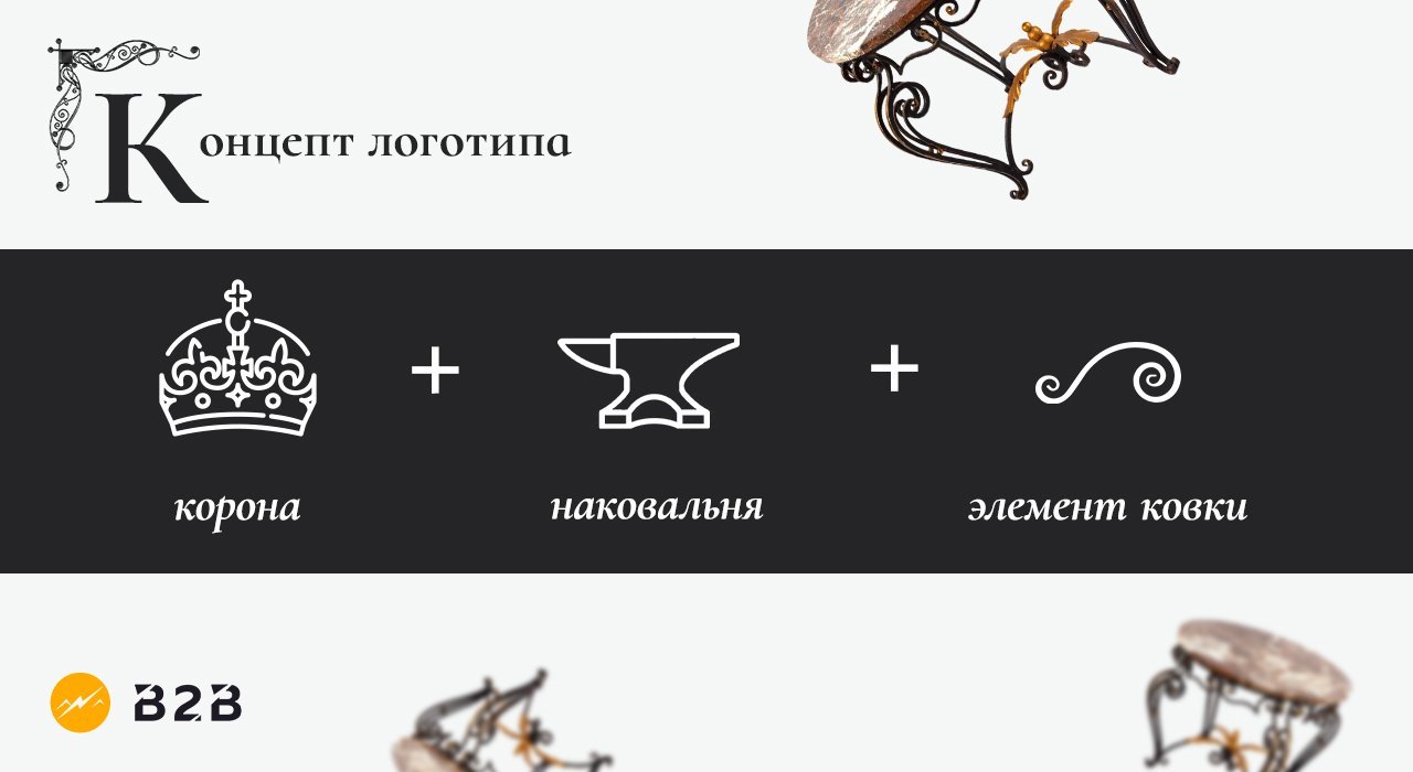 Так как компания занимается изготовлением эксклюзивных кованых изделий, необходимо было создать легкий, современный, но в то же время передающий дух прошлого времени логотип, который бы отличался на рынке. Мы объединили такие элементы, как наковальня, корона (подчеркивает статус), и элемент ковки.