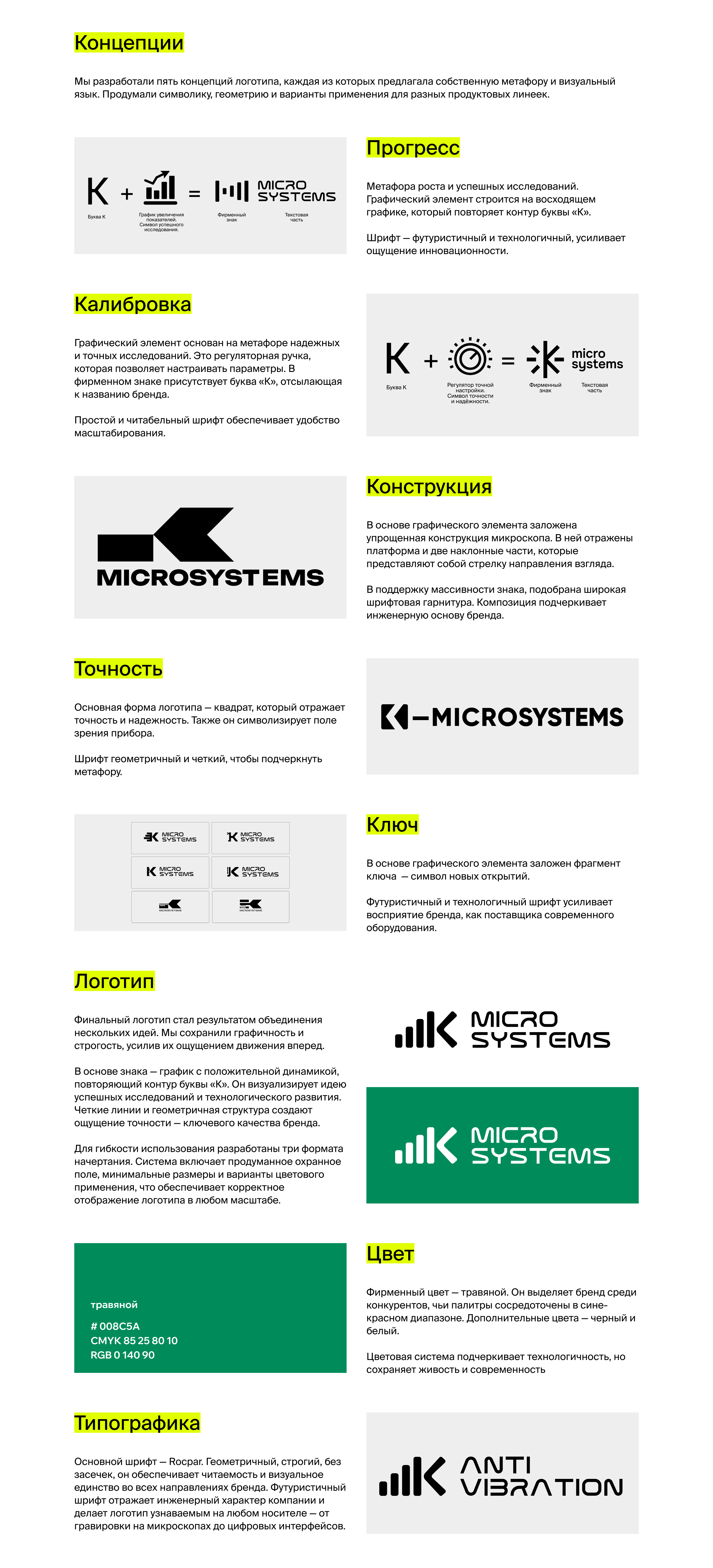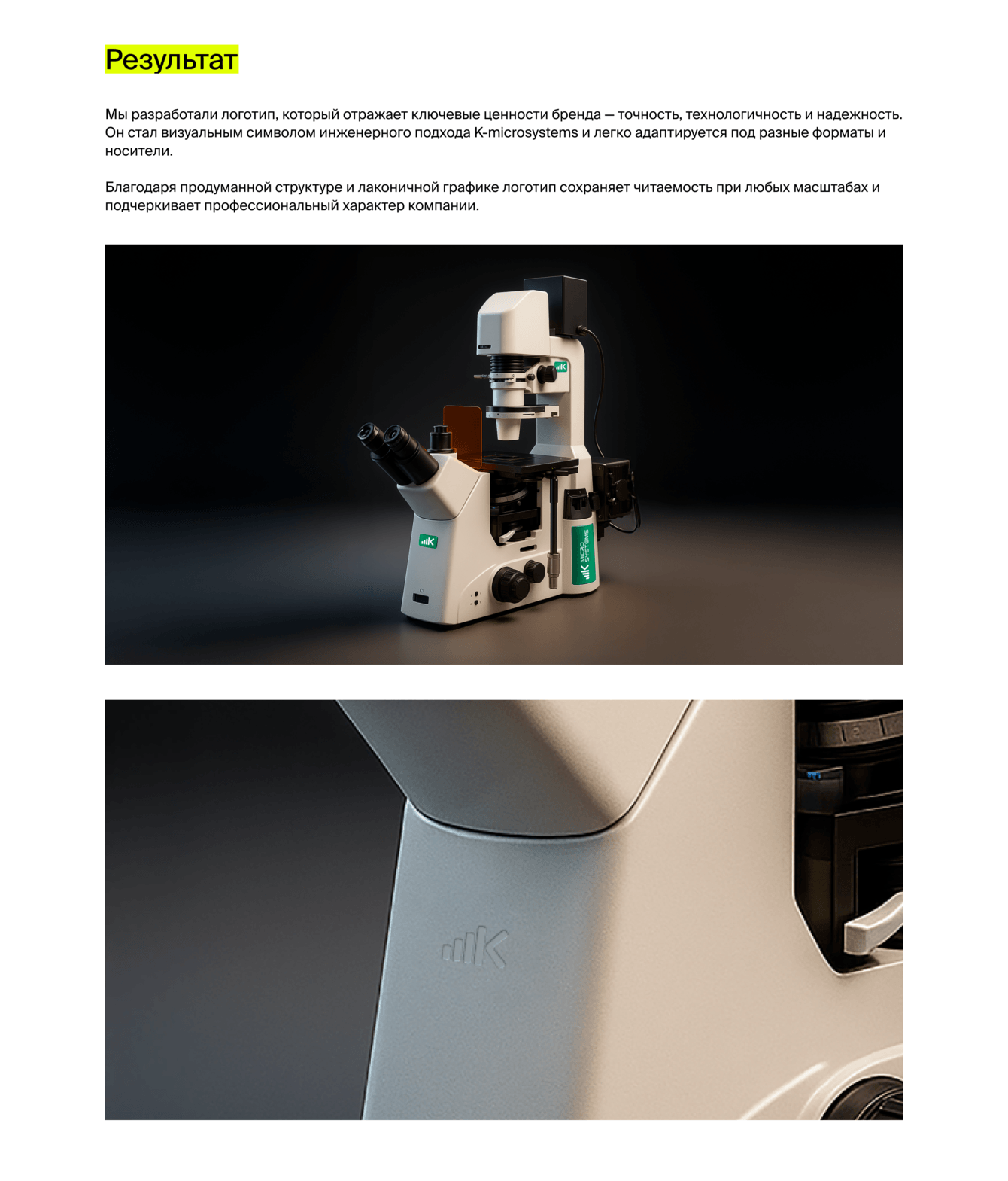 K-microsystems — российский производитель лабораторного оборудования. Клиент обратился к нам с задачей обновить фирменный стиль и разработать логотип, который подчеркнет технологичность бренда и будет легко воспроизводиться на микроскопах и носителях.