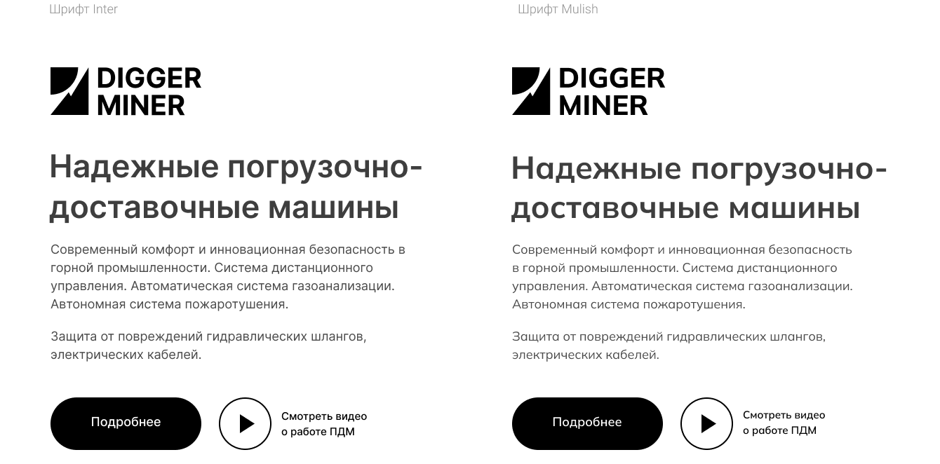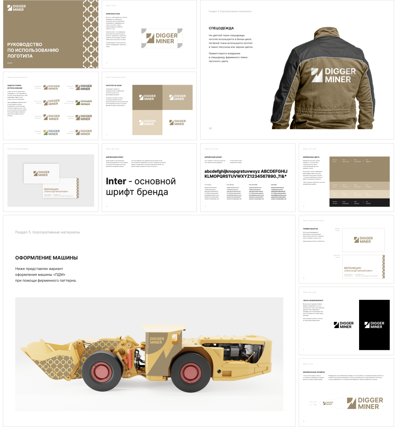 Заказчик уже имел конкретное название бренда — Digger Miner, поэтому наша команда должна была разработать новый идейный логотип, который бы непосредственно ассоциировался с погрузочно-доставочной машиной (сокр. ПДМ — машина, служащая для погрузки и транспортирования отделённой горной породы при подземных горных работах).