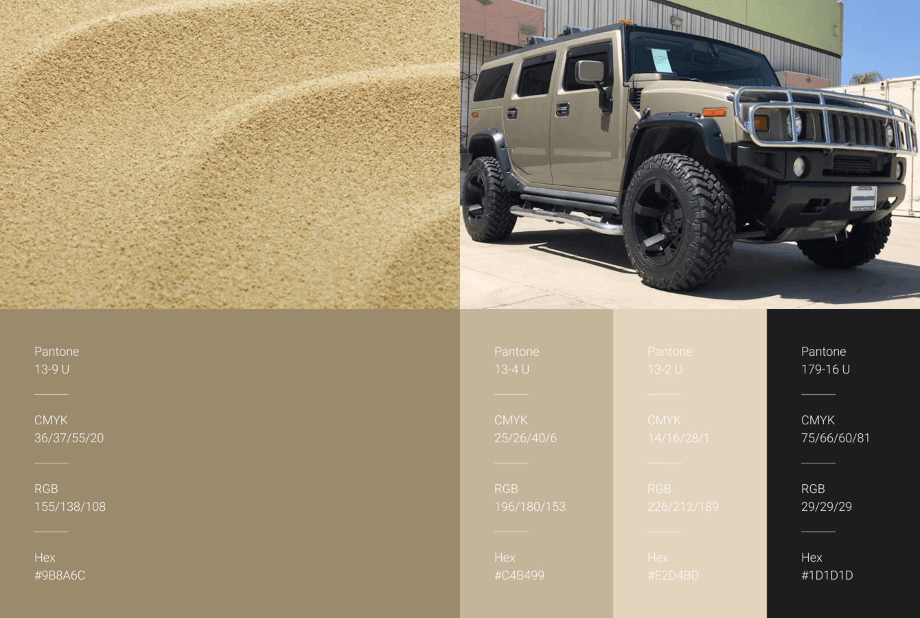 С учетом этих предпочтений, мы решили собрать цветовые референсы, объединяя светло-песочный оттенок с цветом хаки (который обычно ассоциируется с мощной бронетехникой). Это сочетание позволило нам создать глубокий темно-песочный цвет, который не только хорошо смотрится на логотипе, но также легко читается как на светлом, так и на темном фонах.