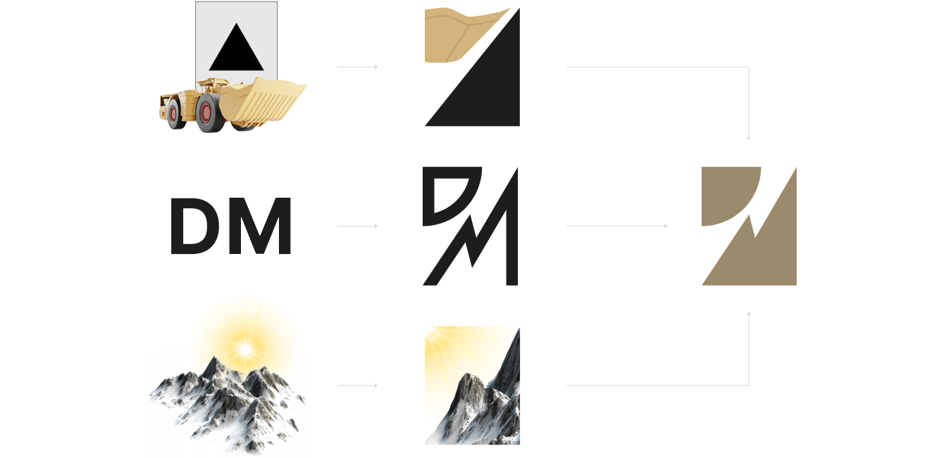 На текущем этапе, казалось бы, мы уже придумали идеальный вариант для логотипа и планировали на нем остановиться. Однако, в творческом процессе всегда есть место для новых идей. И такую идею нам как раз подкинул один из членов нашей команды — объединить и затем стилизовать в единое целое элементы, отражающие суть бренда Digger Miner: машину ПДМ (а именно ковш), герб города Магнитогорска (место, где находится компания), кирку или гору (как символ горнодобывающей промышленности), а также две заглавные буквы D и M.