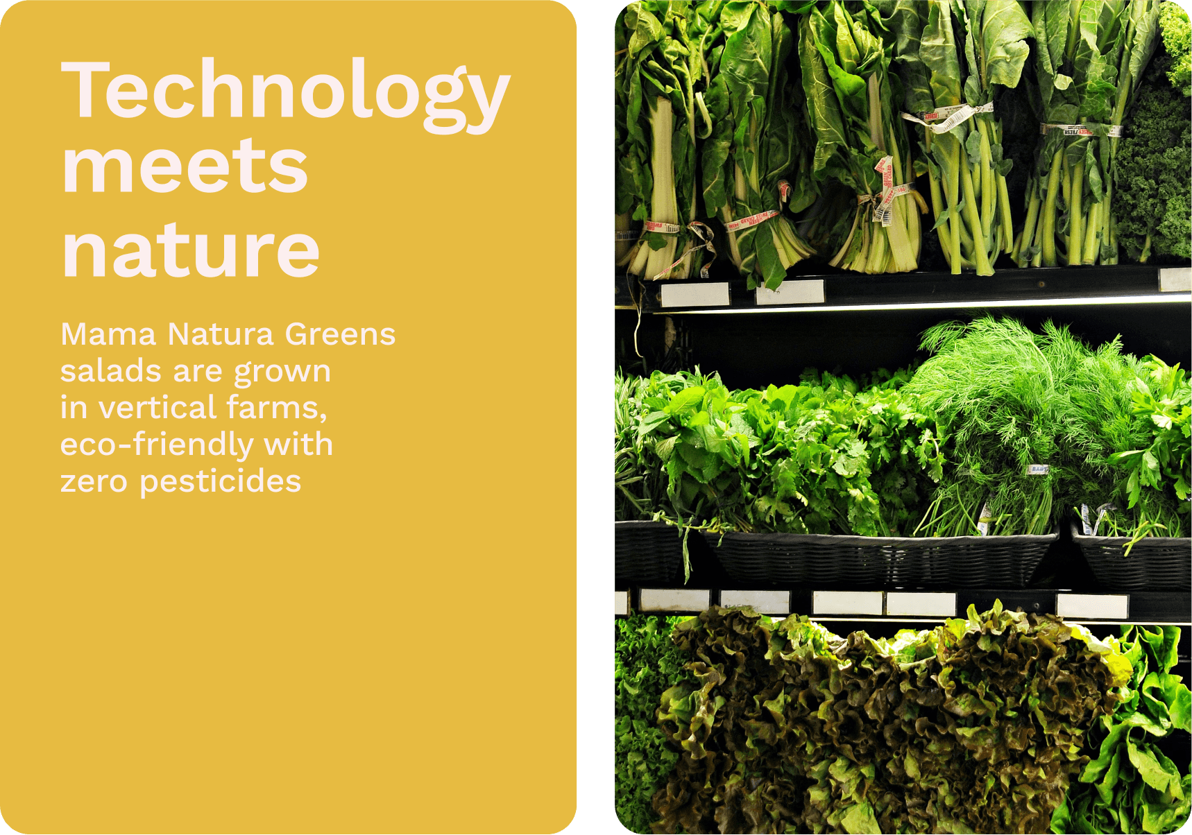 Mama Natura Greens — это бренд, известный своим высококачественным ассортиментом салатов и зелени. Вся продукция выращивается локально в Дубае с использованием передовых технологий вертикального земледелия от iFarm. Салаты Mama Natura Greens растут в экологичных вертикальных фермах, без использования пестицидов.
