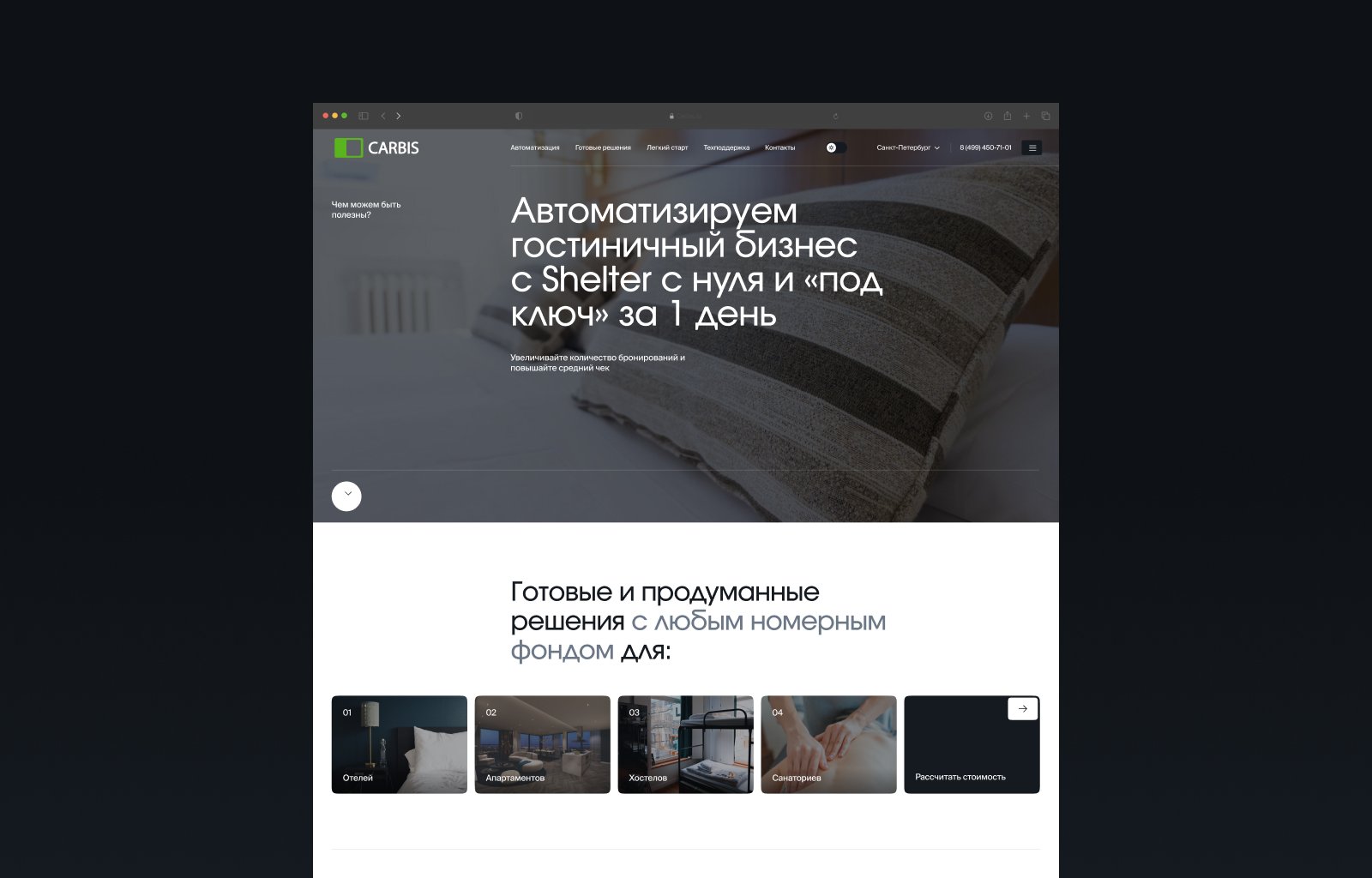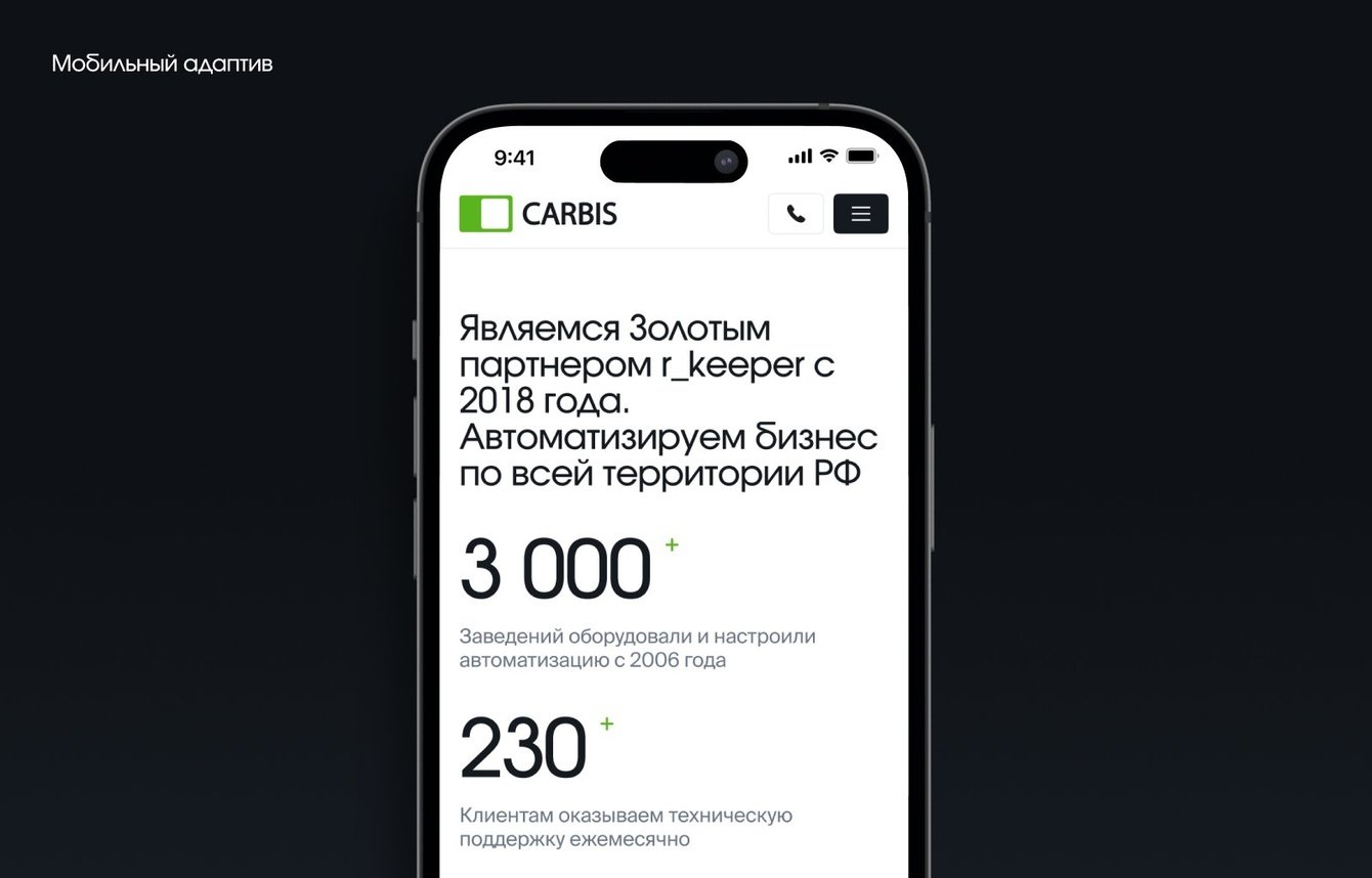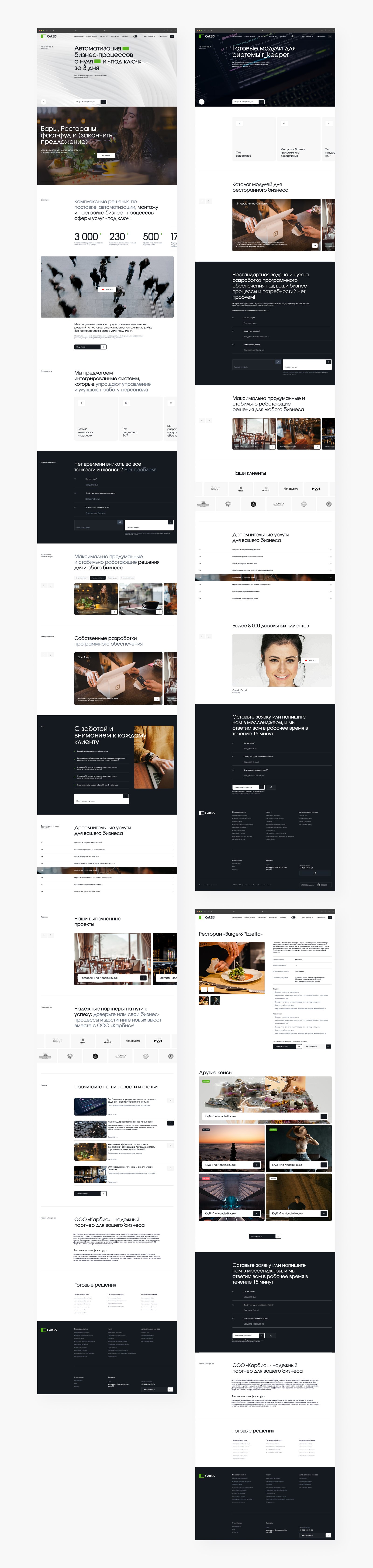 Компания Carbis занимается автоматизацией бизнес-процессов в сфере услуг, создавая комплексные решения «под ключ» для ресторанов, гостиниц, фитнес-клубов и других предприятий общепита, HORECA. Помимо этого, у них есть собственные IT-разработки и ПО, решающие самые востребованные задачи ресторанного (и не только) бизнеса. На сайте нужно было не просто рассказать об этом, но и передать весь масштаб их работы, при этом — на понятном и удобном, для пользователя, языке.