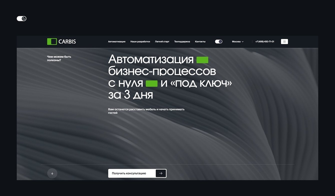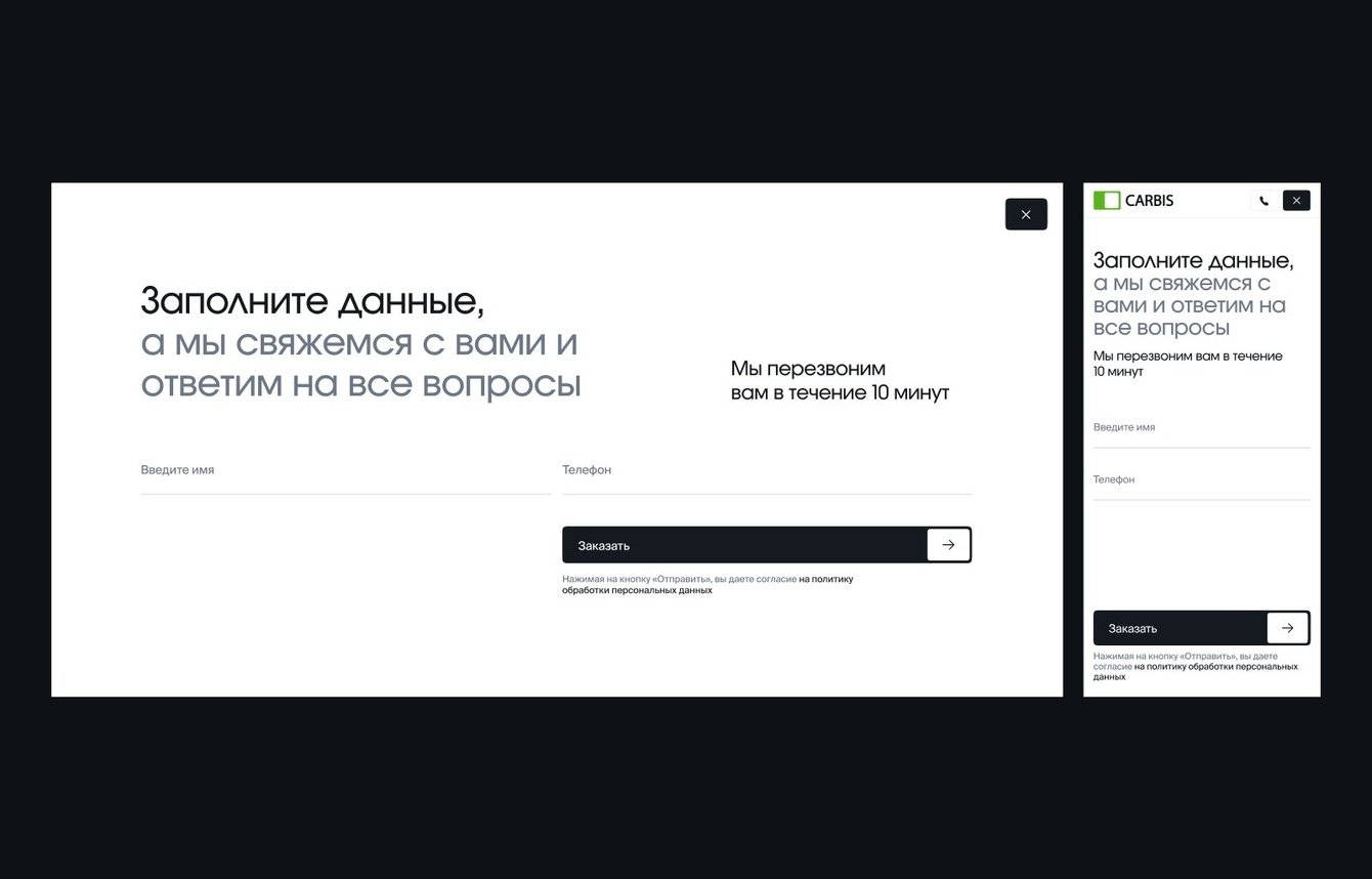 На основе утвержденных прототипов и мудбордов создали современный и стильный дизайн, который отражает бренд Carbis. Использовали фирменные цвета и графику, чтобы подчеркнуть профессионализм, технологичность и надежность компании.