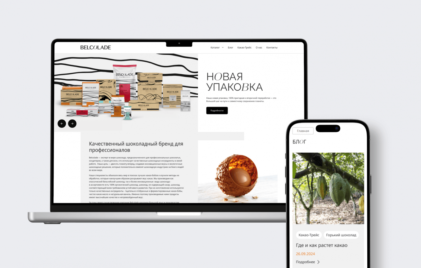 Разработать корпоративный сайт в рамках существующей айдентики бренда Belcolade. Также важной задачей было сохранить принципы организации блоков основного сайта компании для сохранения визуальной преемственности ресурсов.
