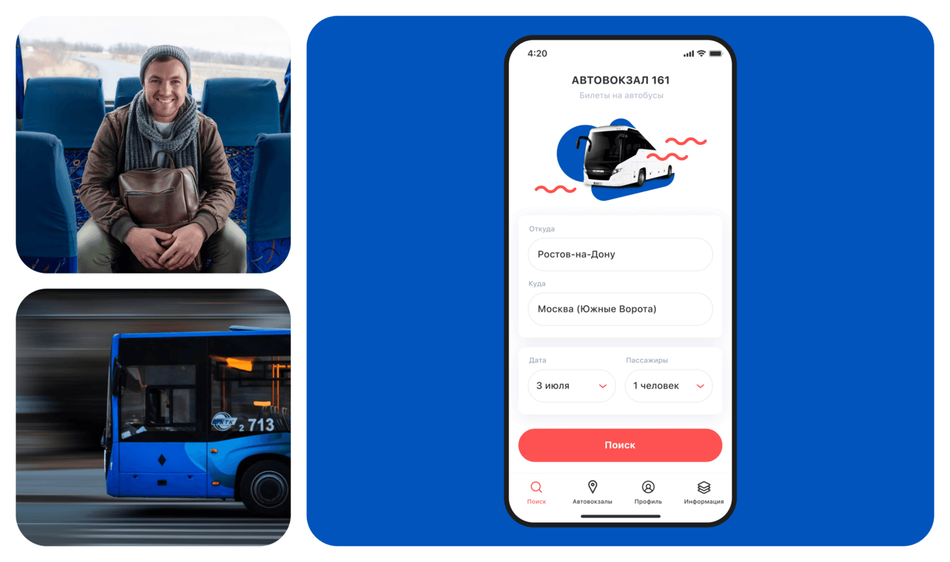 Задача: разработать приложение автовокзала, в котором процесс покупки билета будет максимально простым и удобным.