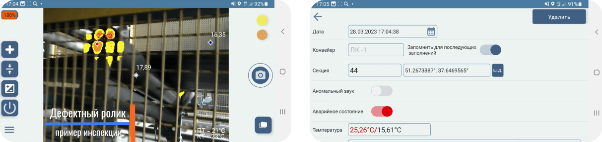Система позволяет автоматически выявить неисправные ролики и барабаны на ранней стадии, а также места трения ленты о став конвейера, с помощью тепловизионного контроля элементов конвейера. Применение технологии дополненной реальности (AR) повышает эффективность инспекции и помогает оперативно предотвращать аварийные ситуации.Полученные с помощью системы результаты по работе конвейерных роликов для каждого конвейера сохраняются в базе данных по работе конвейерных роликов для каждого конвейера и включают в себя:изображения с выделенными областями превышения температур,данные об элементе конвейера,геолокацию элемента для быстрого поиска и др. результаты мониторинга.На основании бланка инспекции формируется общий отчет о результатах мониторинга, что позволяет автоматизировать работу службы ТОиР. Использование системы снижает неблагоприятное влияние техногенного шума конвейера на обходчика, так как он может использовать наушники в качестве СИЗ.В процессе разработки наши специалисты оперативно осуществляли обратную связь, вносили улучшения и корректировки, а также организовывали встречи с заказчиком в нашем офисе для приемки результатов работ.