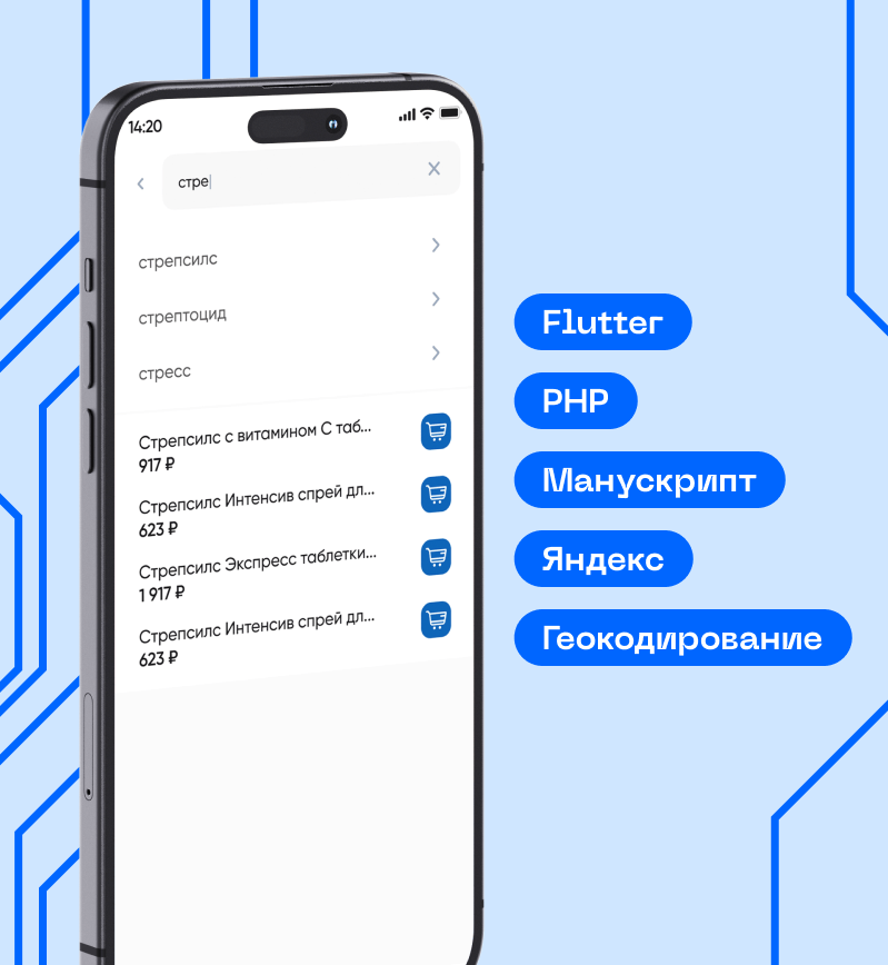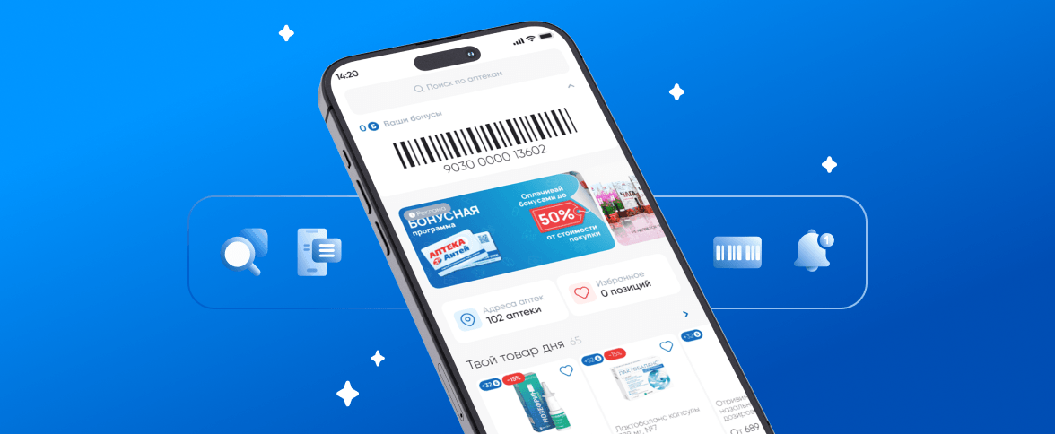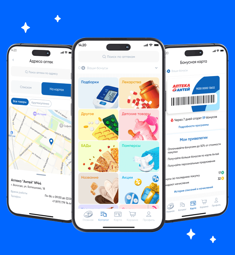 Разработать мобильное приложение для федеральной сети аптек «Антей», которое будет понятно и удобно для разных категорий пользователей — от молодёжи до пожилых людей. Важно было уложиться в бюджет в 2,5 млн рублей, соблюсти сроки реализации и выполнить ключевые интеграции: с системой Manuscript и Яндекс.Геокодированием. Также требовалось обеспечить высокую производительность, простоту сопровождения и масштабируемость решения.