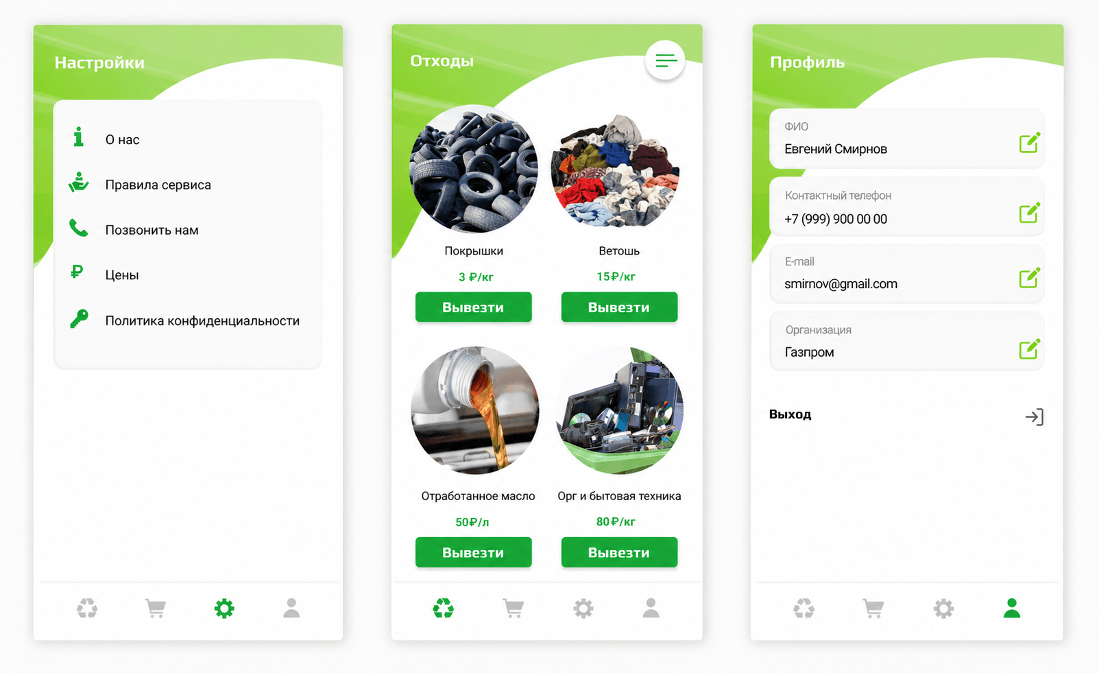 Мобильное приложение позволяет сделать заказ на утилизацию разного уровня загрязнений и мусора с помощью простого интерфейса, а также второе мобильное приложение для работы менеджеров. Приложения интегрированы с 1С и используют его в качестве базы данных.