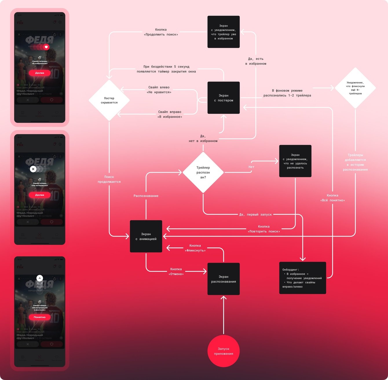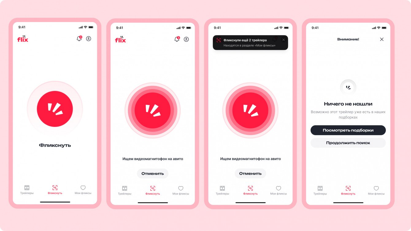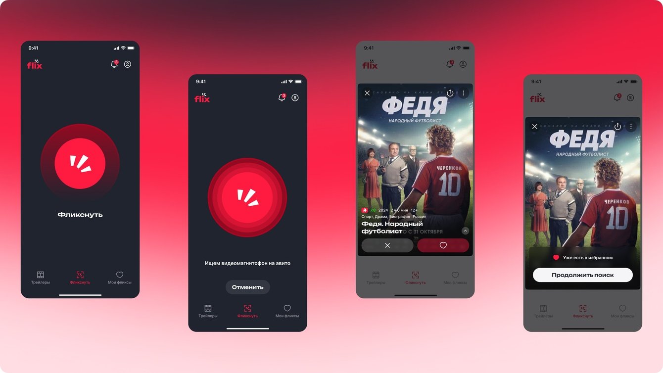 Название Flix выбрано клиентом как производное от Flicks — неформального обозначения фильмов. Это слово используется в разговорной речи, а короткое и звучное название делает приложение и его основную функцию «фликснуть» запоминающимися и интуитивно понятными для пользователей. Flix — это кино в одно касание.