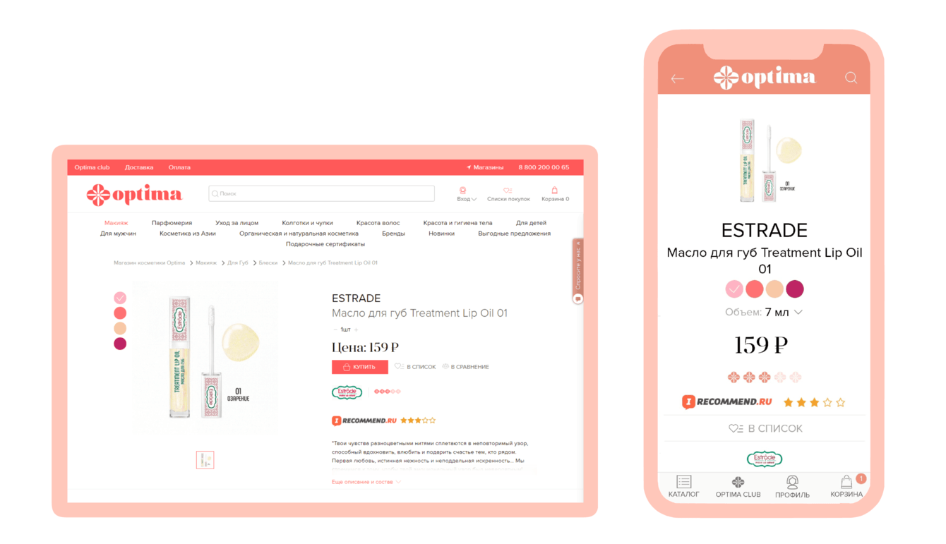 Оптима - это быстро развивающаяся сеть магазинов косметики и парфюмерии. В сети более 90 магазинов по всей России. В 2017 году сеть запустила свой первый интернет-магазин. Анализ источников трафика магазина показал, что 65% пользователей совершают покупки через мобильное приложение. Клиент решил разработать мобильное приложение для более комфортных пользовательских покупок. Важное требование - сделать дизайн в соответствии с текущим интернет-магазином.