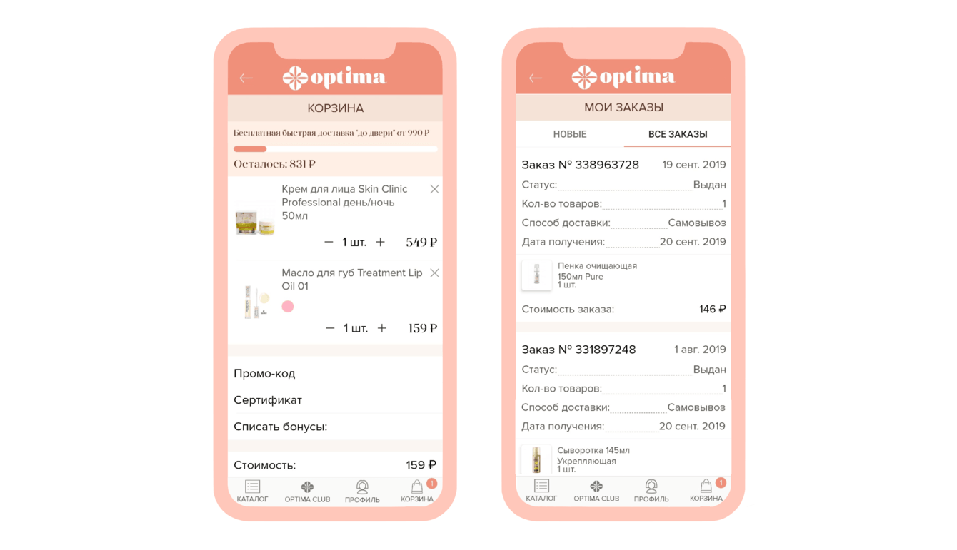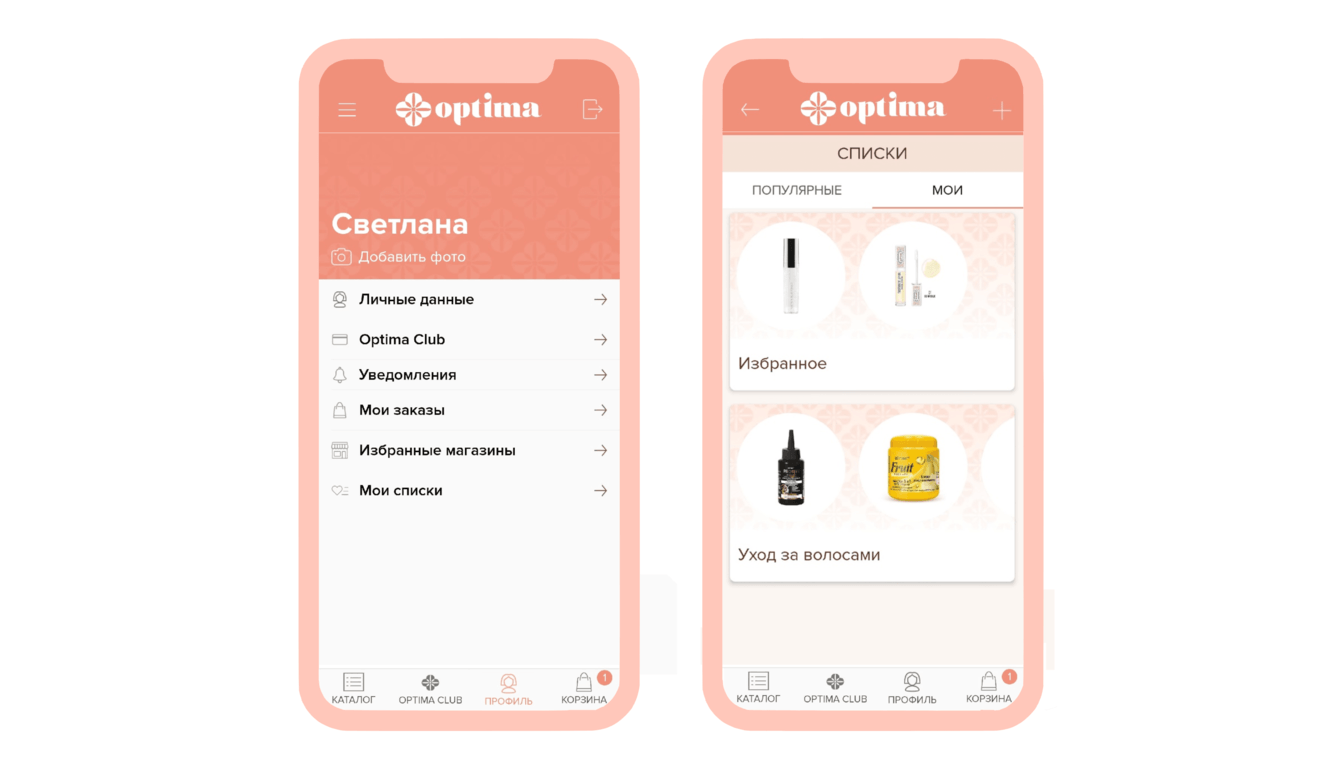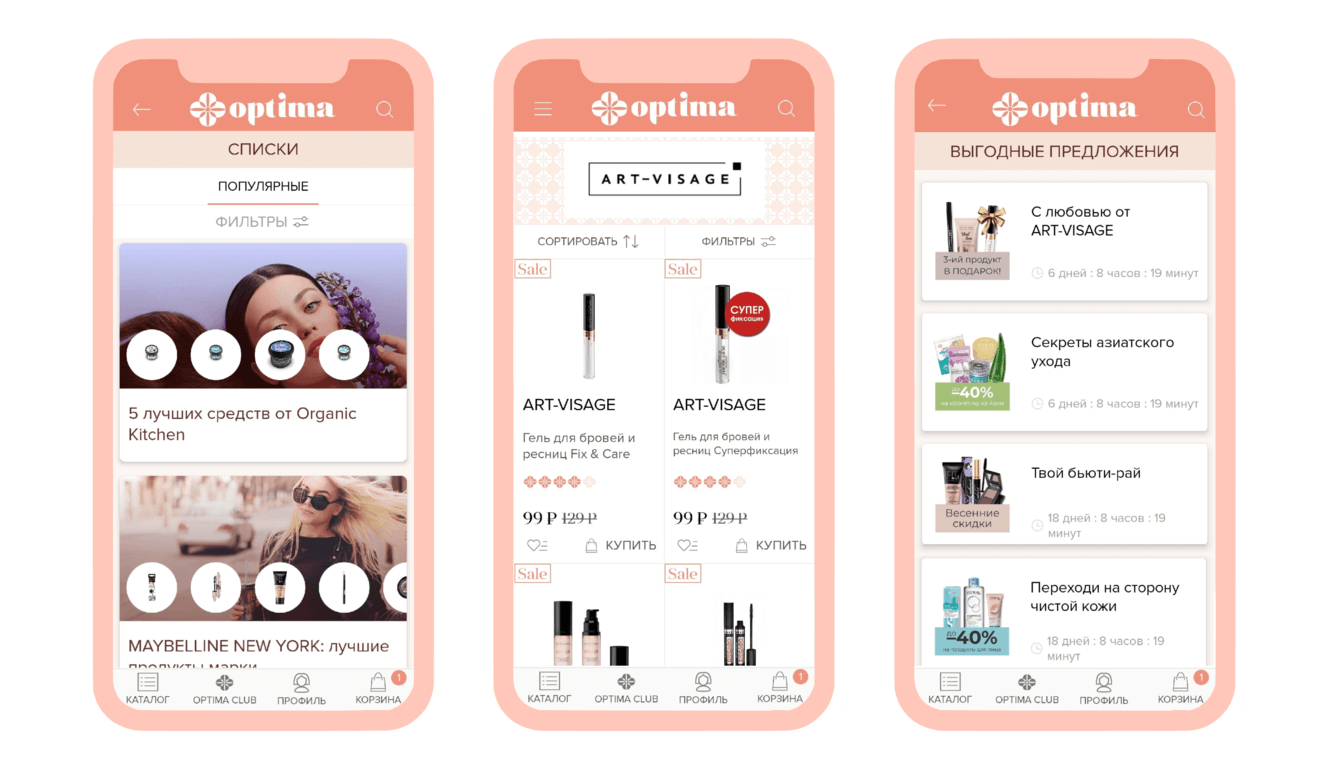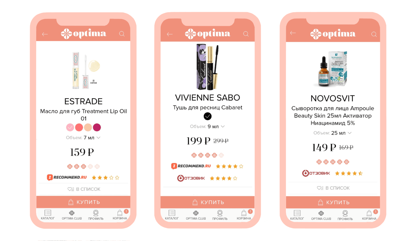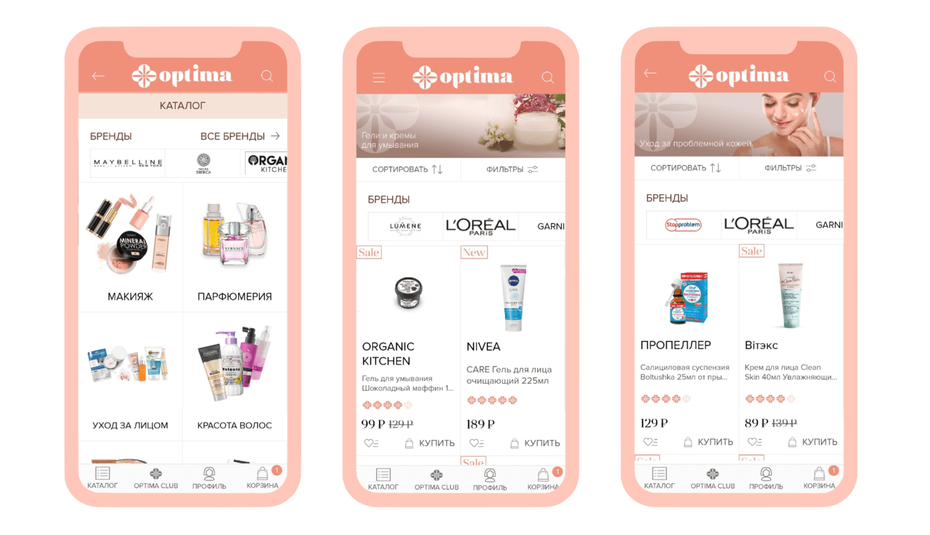 Оптима - это быстро развивающаяся сеть магазинов косметики и парфюмерии. В сети более 90 магазинов по всей России. В 2017 году сеть запустила свой первый интернет-магазин. Анализ источников трафика магазина показал, что 65% пользователей совершают покупки через мобильное приложение. Клиент решил разработать мобильное приложение для более комфортных пользовательских покупок. Важное требование - сделать дизайн в соответствии с текущим интернет-магазином.