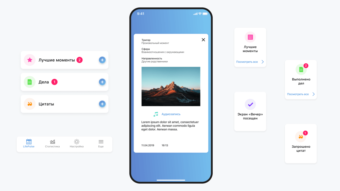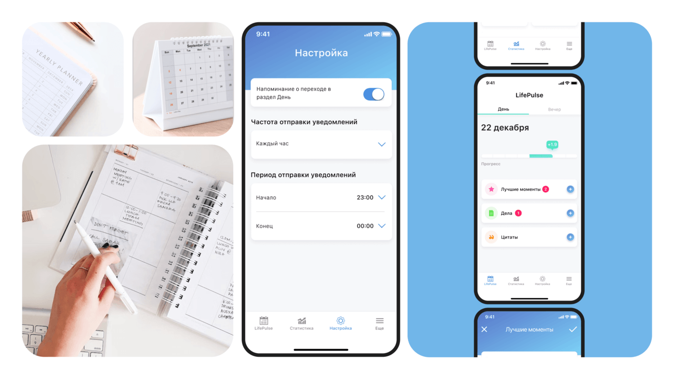 • экран «День» с метрикой «Прогресс», блоками «Дела», «Впечатления», «Цитаты» и отметкой о факте посещения экрана «Вечер»;