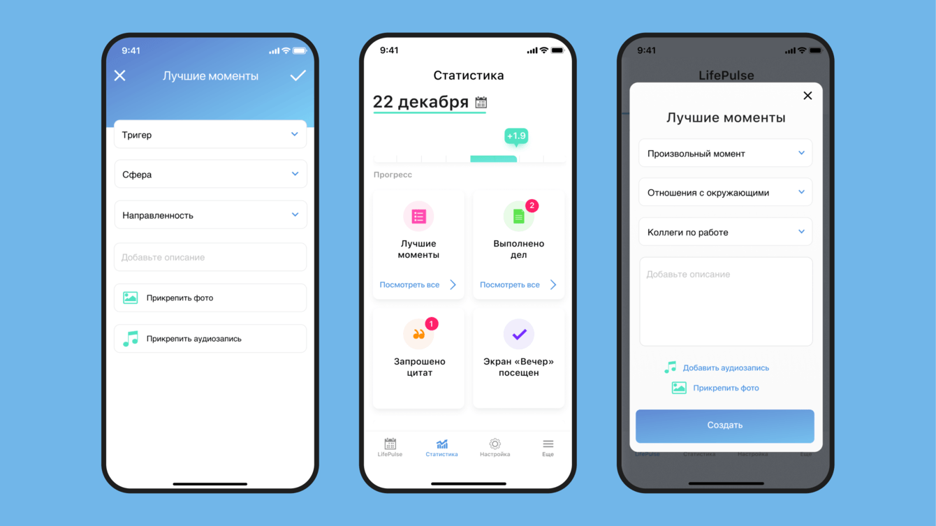 Для создания «Впечатления» пользователю нужно выбрать сферу, триггер и направленность события из выпадающих списков. Событие можно прокомментировать в соответствующем поле, а также добавить к нему одно изображение и одно аудио.