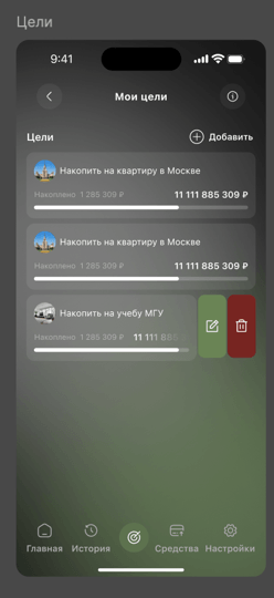 Модуль целей позволяет копить на конкретные покупки: пользователь задаёт название цели и целевую сумму, прогресс отображается бегунком. Лимиты бюджета устанавливаются на день, неделю или месяц с выбором даты начала и опцией повтора. При превышении лимита на главном экране появляется красный индикатор-предупреждение.