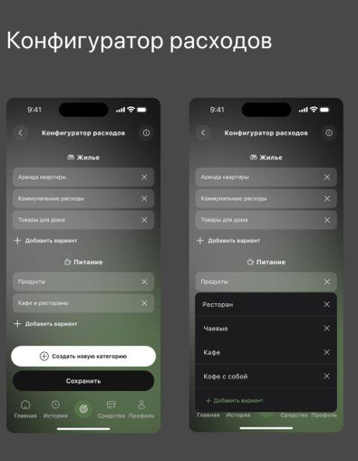 Многоуровневый конфигуратор расходов. Пользователь сам создаёт структуру категорий расходов до трёх уровней вложенности (категория → подкатегория → подподкатегория) с неограниченным количеством элементов. Эта структура динамически используется во всём приложении — в форме нового расхода, аналитике, фильтрах истории.