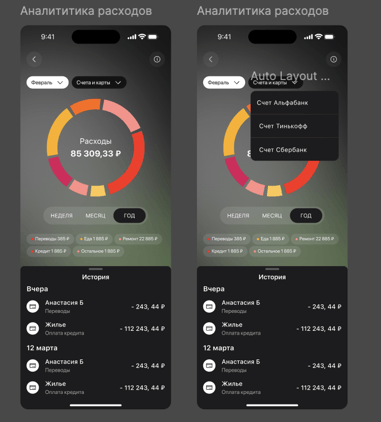 Раздел аналитики доступен как со своей страницы, так и в сокращённом виде прямо с главного экрана. Отображает общую сумму трат/доходов за выбранный период, диаграмму распределения, разбивку по категориям расходов (из конфигуратора) и источникам дохода, а также хронологический список транзакций. Фильтрация по периоду (неделя/месяц/год) и по конкретным счетам.