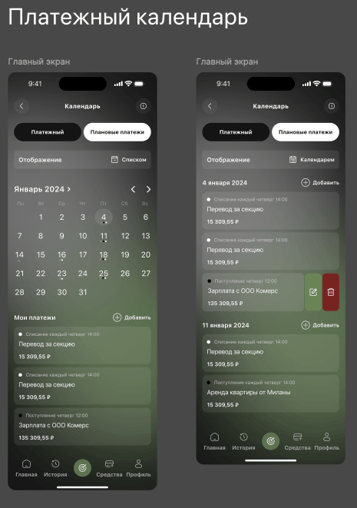 Двойной режим отображения — календарь и список. Цветовая маркировка типов платежей: зелёный (доход), красный (расход), белый (планируемый доход), чёрный (планируемый расход). Фильтрация по периоду (день/неделя/месяц), по типу платежа, по произвольному диапазону дат. Поддержка навигации по месяцам без ограничений — как вперёд, так и назад. Редактирование и удаление транзакций свайпом справа налево.