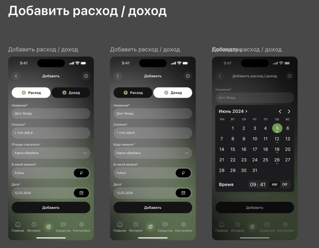 Модуль «Доступные средства» поддерживает создание неограниченного числа источников хранения (карты, вклады, наличные, криптовалюта, сбережения). Реализован перевод средств между счетами с автоматическим и ручным курсом конвертации. Логика курса работает по принципу «задай любые два из трёх параметров» (сколько списать / сколько пополнить / курс) — третий рассчитывается автоматически. При нажатии на любой счёт открывается история операций по нему — по аналогии с мобильным банком.