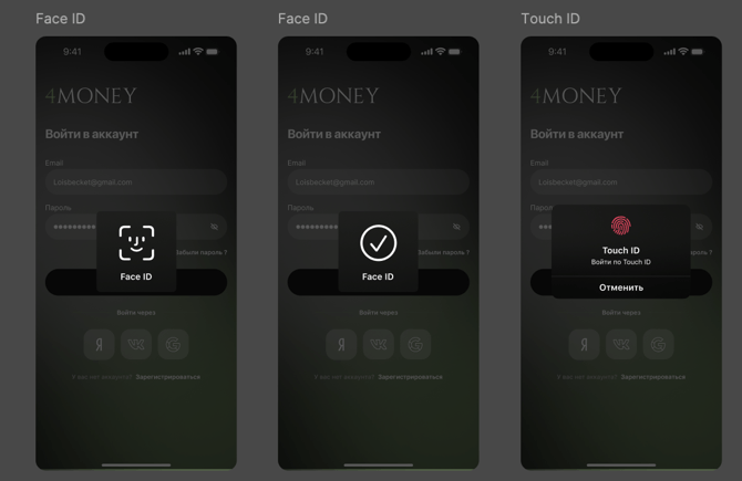 Комплексная система авторизации. Приложение поддерживает несколько способов входа одновременно: email/пароль, социальные сети (Яндекс, ВКонтакте, Google), 4-значный PIN-код, Face ID / Touch ID. Все способы работают параллельно с корректной логикой приоритетов и fallback-сценариями.