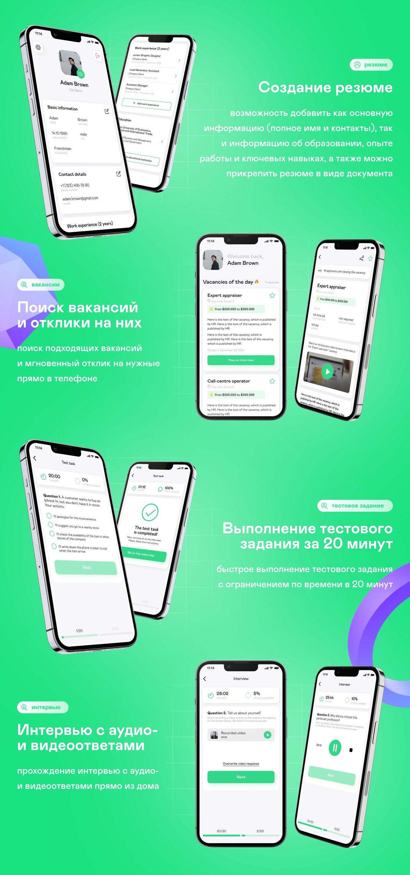 Мобильное приложение должно сократить затраты времени и ресурсов на найм сотрудников и поиск работы, сделать процесс на 100% прозрачным и простым, обеспечить качественную коммуникацию между работодателями и кандидатами.